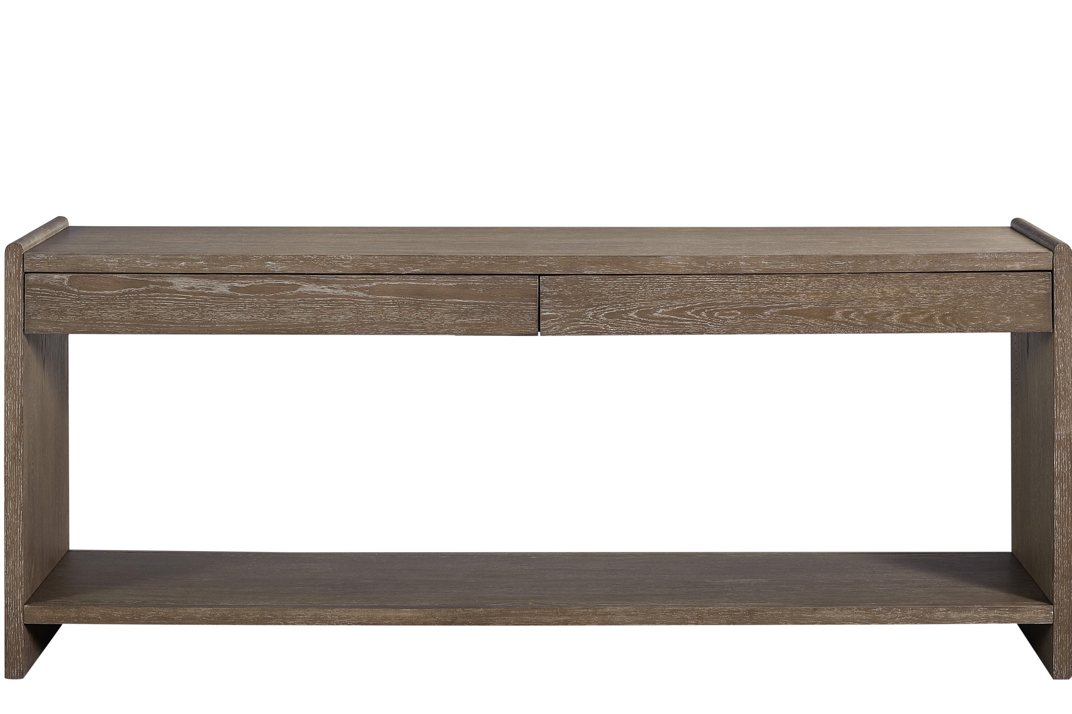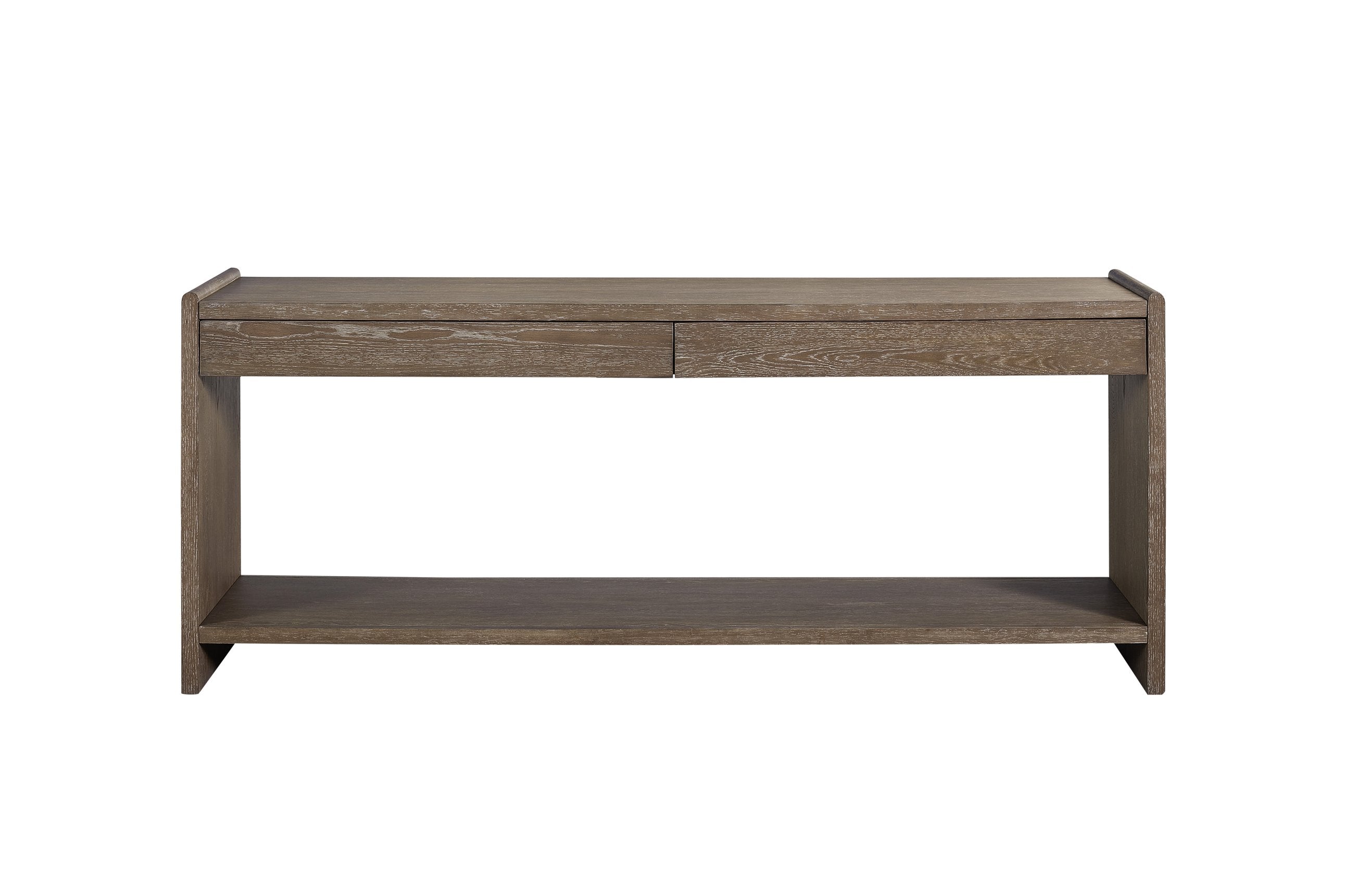 Bring rustic warmth and practical storage to your entryway or living room with this streamlined two-drawer sofa table. Its weathered-grain wood finish and minimalist silhouette deliver a versatile look that pairs well with modern, transitional, or industrial interiors, while thoughtful details—like soft-closing drawers and a roomy bottom shelf—make everyday use quiet and convenient.