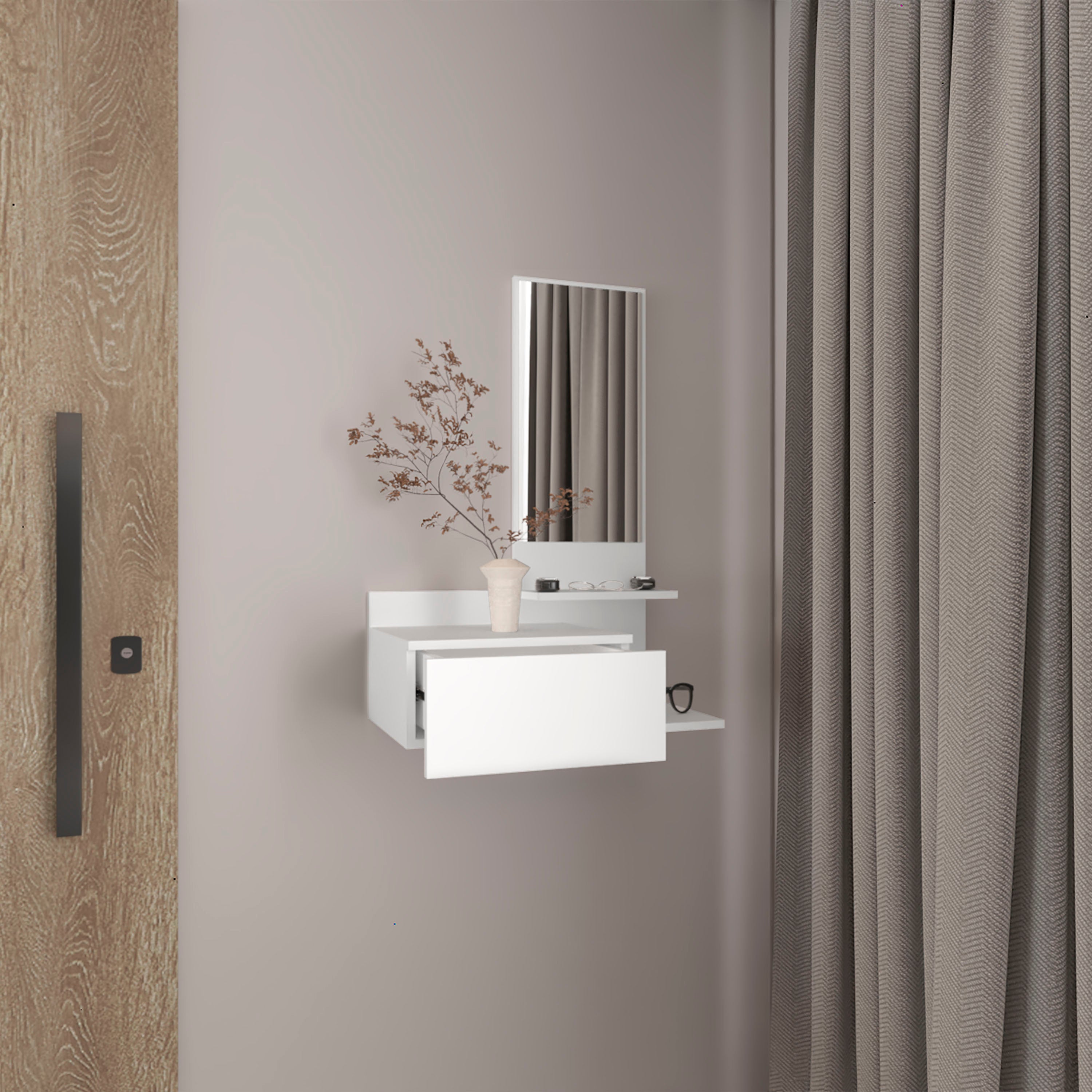 Elevate your entryway or bedroom with this sleek, modern console that combines style and storage in a compact footprint. The Vienna floating mirror console features three open tiers for display, a full-extension drawer for concealed storage, and an integrated mirror — all designed to keep essentials organized while enhancing contemporary decor.