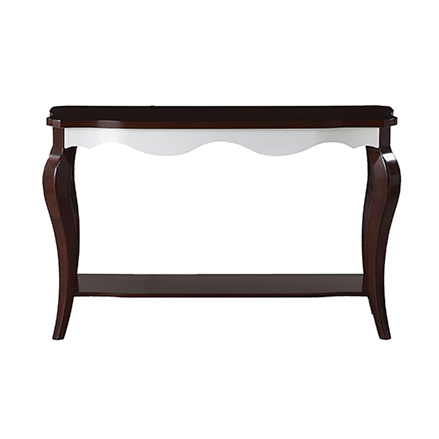 Elevate your living space with this elegant two-tone sofa table that blends classic silhouette with contemporary versatility. The walnut-finished top contrasts beautifully with a crisp white scrolled apron and graceful cabriole legs, creating a refined focal point for an entryway, behind a sofa, or along a hallway. Its streamlined open base and fixed top provide a stable, understated platform to display lamps, vases, or treasured décor while maintaining an airy, uncluttered feel.