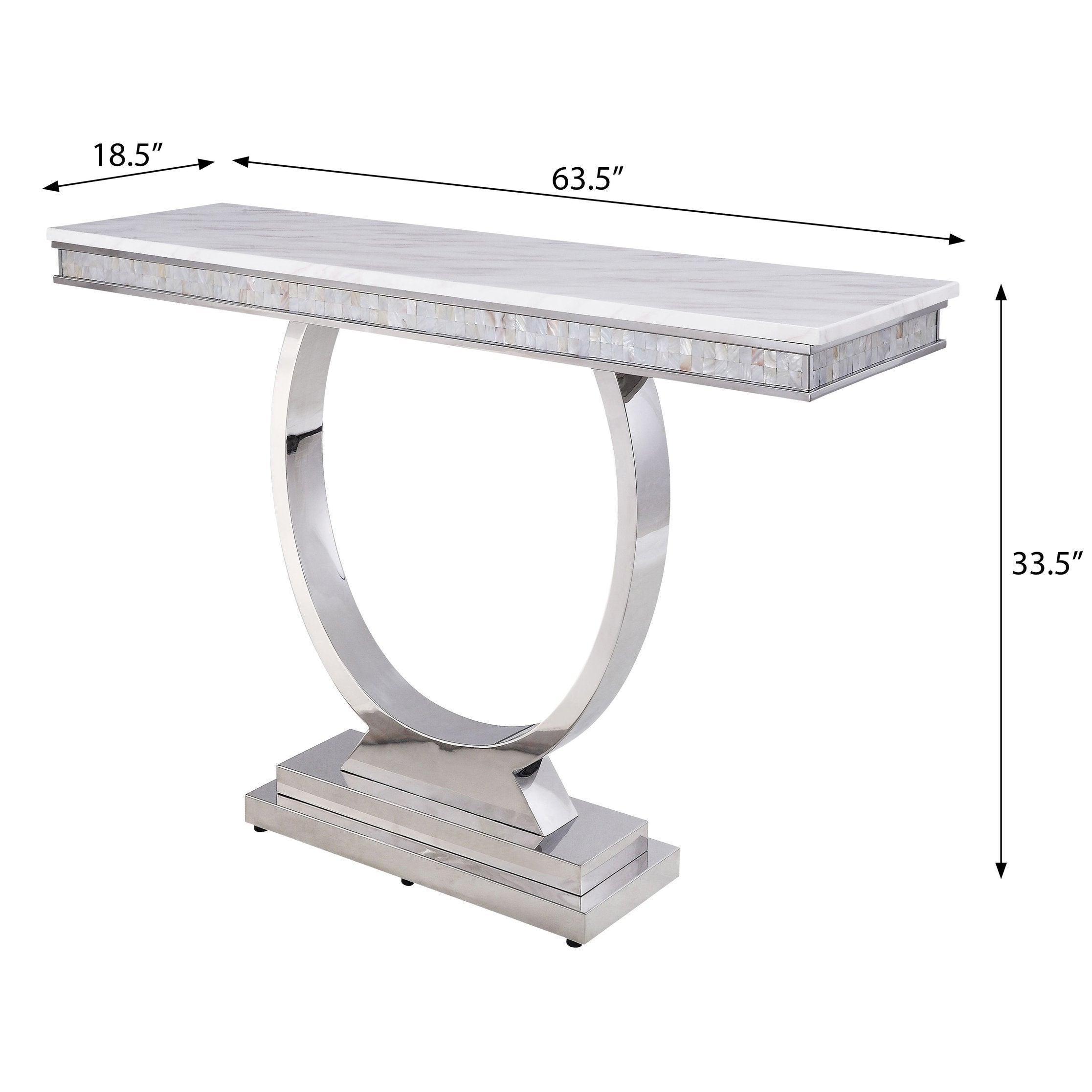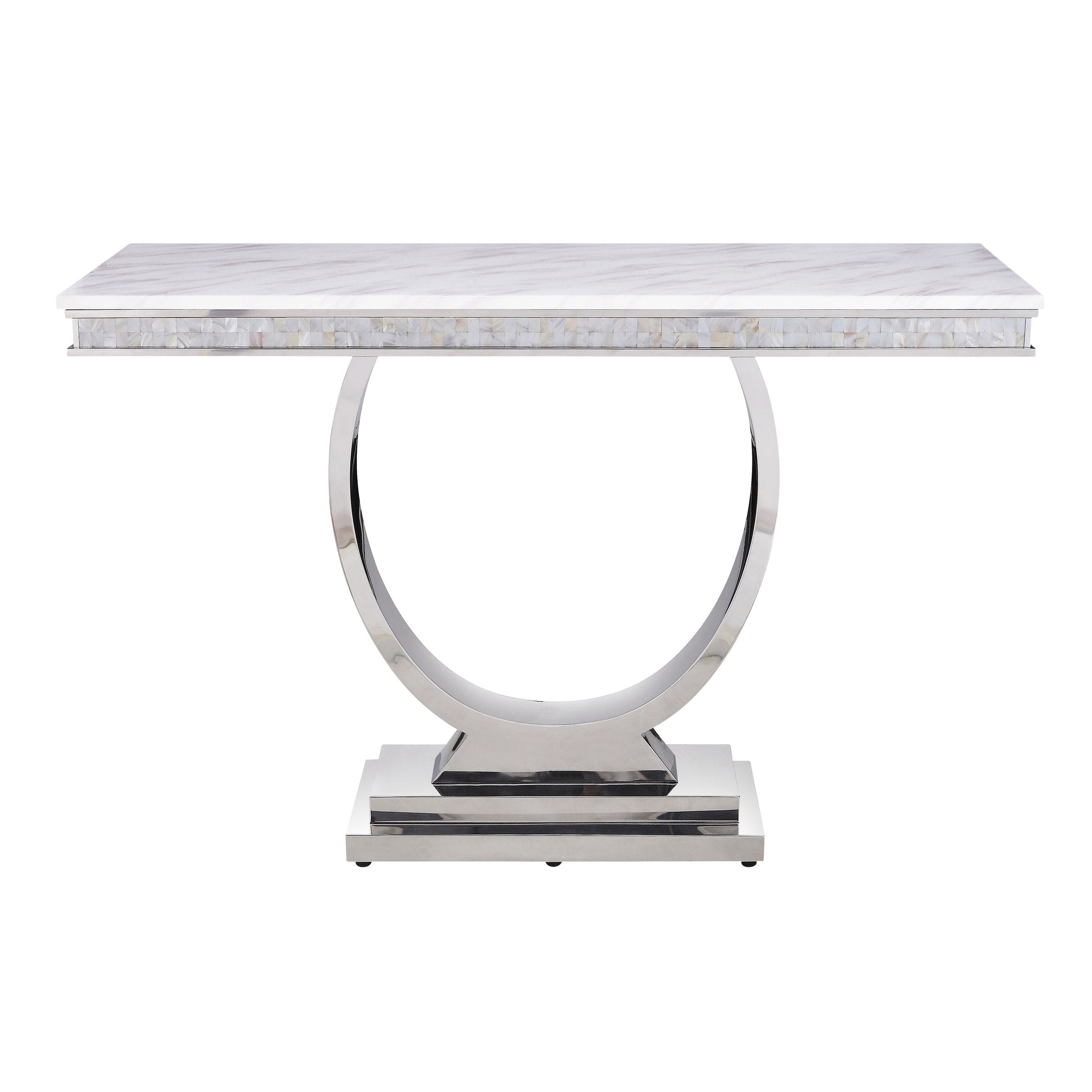 Elevate your living space with this elegant white and silver sofa table, designed to blend contemporary style with durable construction. The table pairs a refined cultured (artificial) marble top with a strong stainless steel frame and mirrored silver finish, creating a bright, polished focal point for your entryway, behind a sofa, or along a hallway. Its clean lines and neutral palette make it easy to coordinate with modern, transitional, or glam interiors.