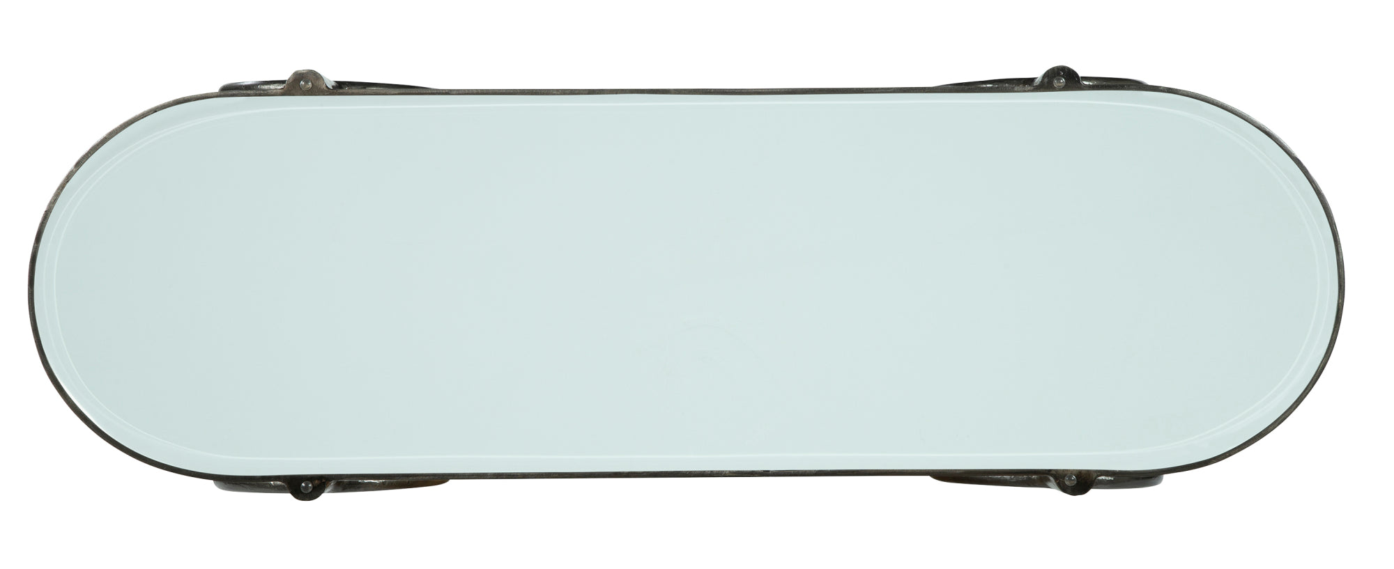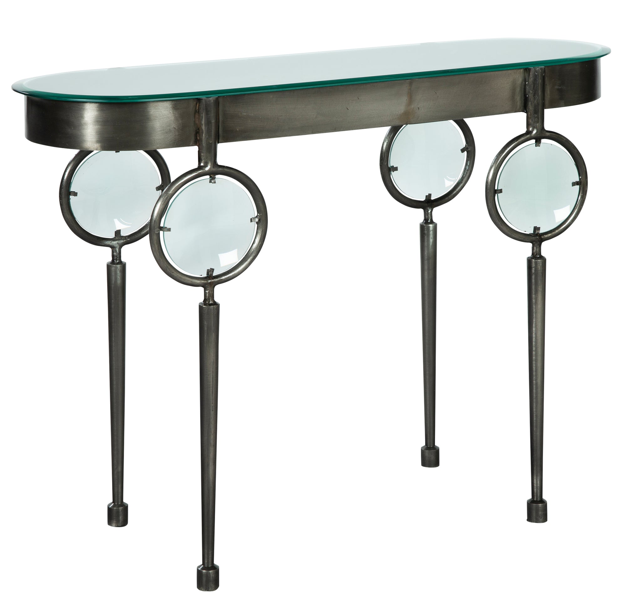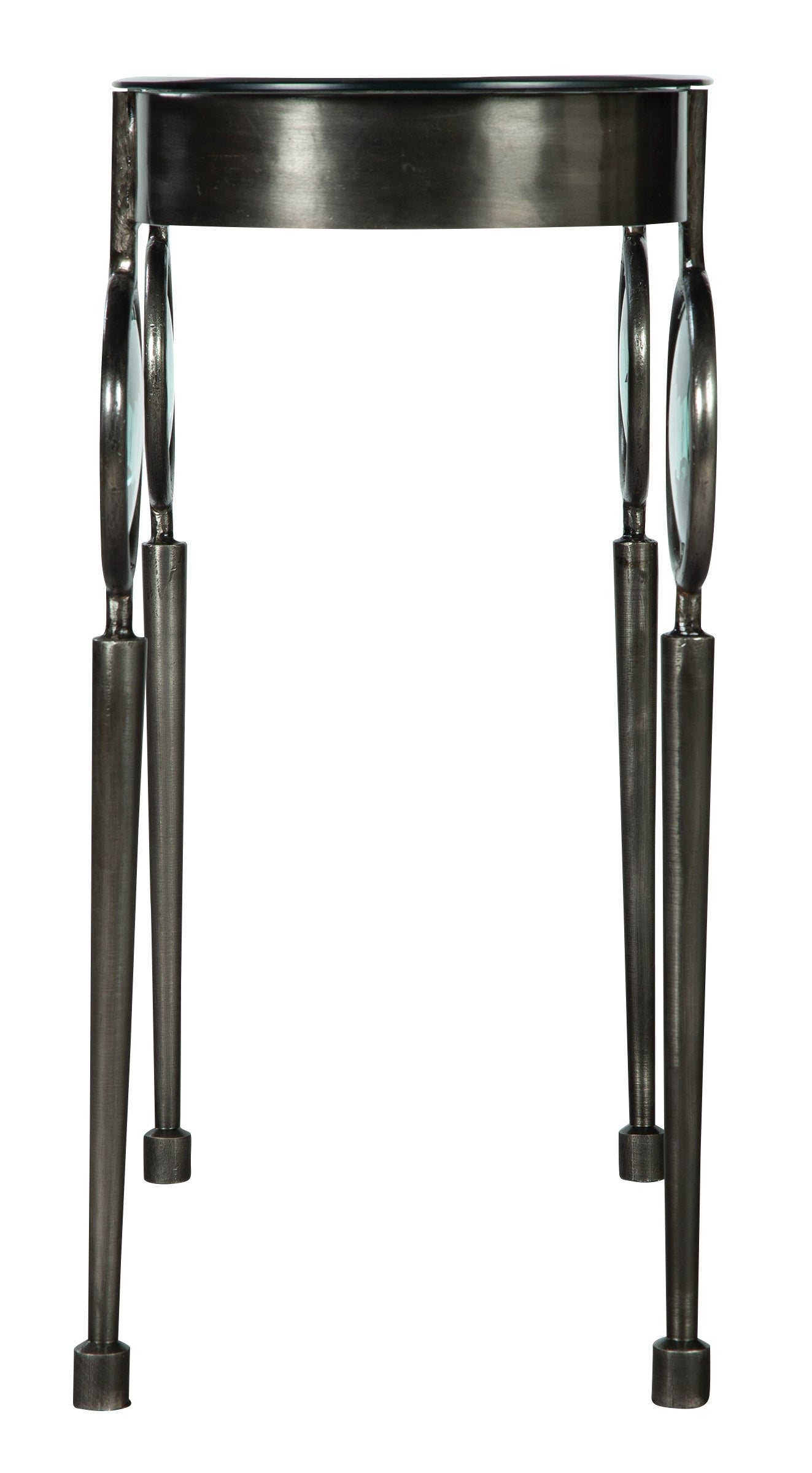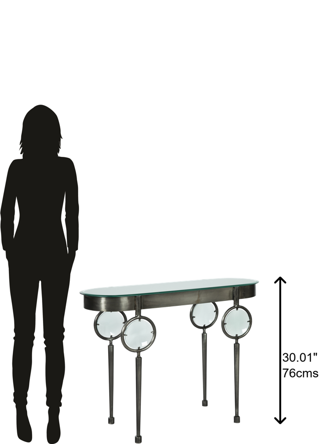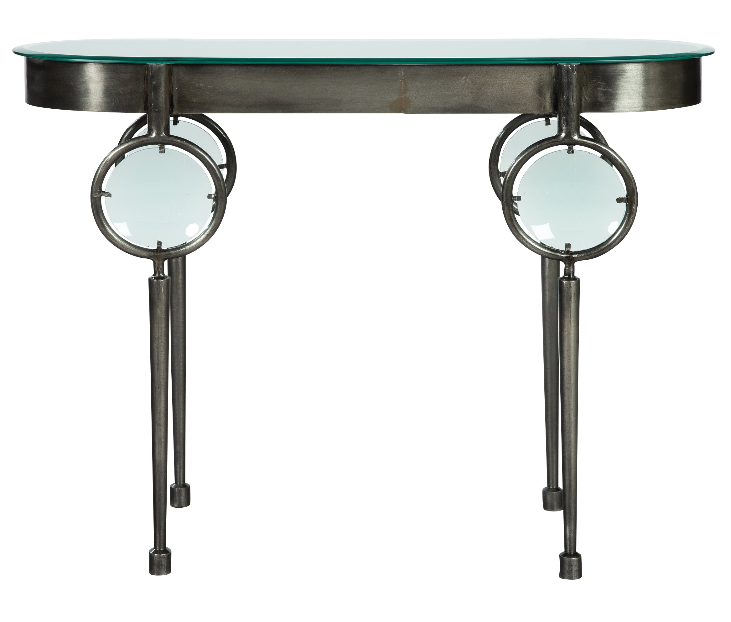 - A unique design element in the iron frame and legs are the decorative, hand poured magnifying glass discs.