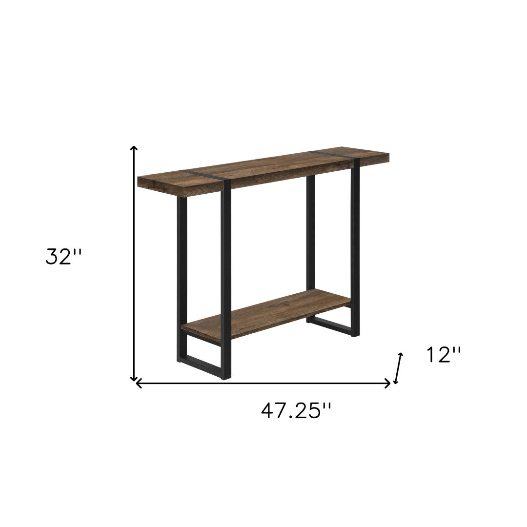 - Two tier rustic modern farmhouse console table with reclaimed wood look top.