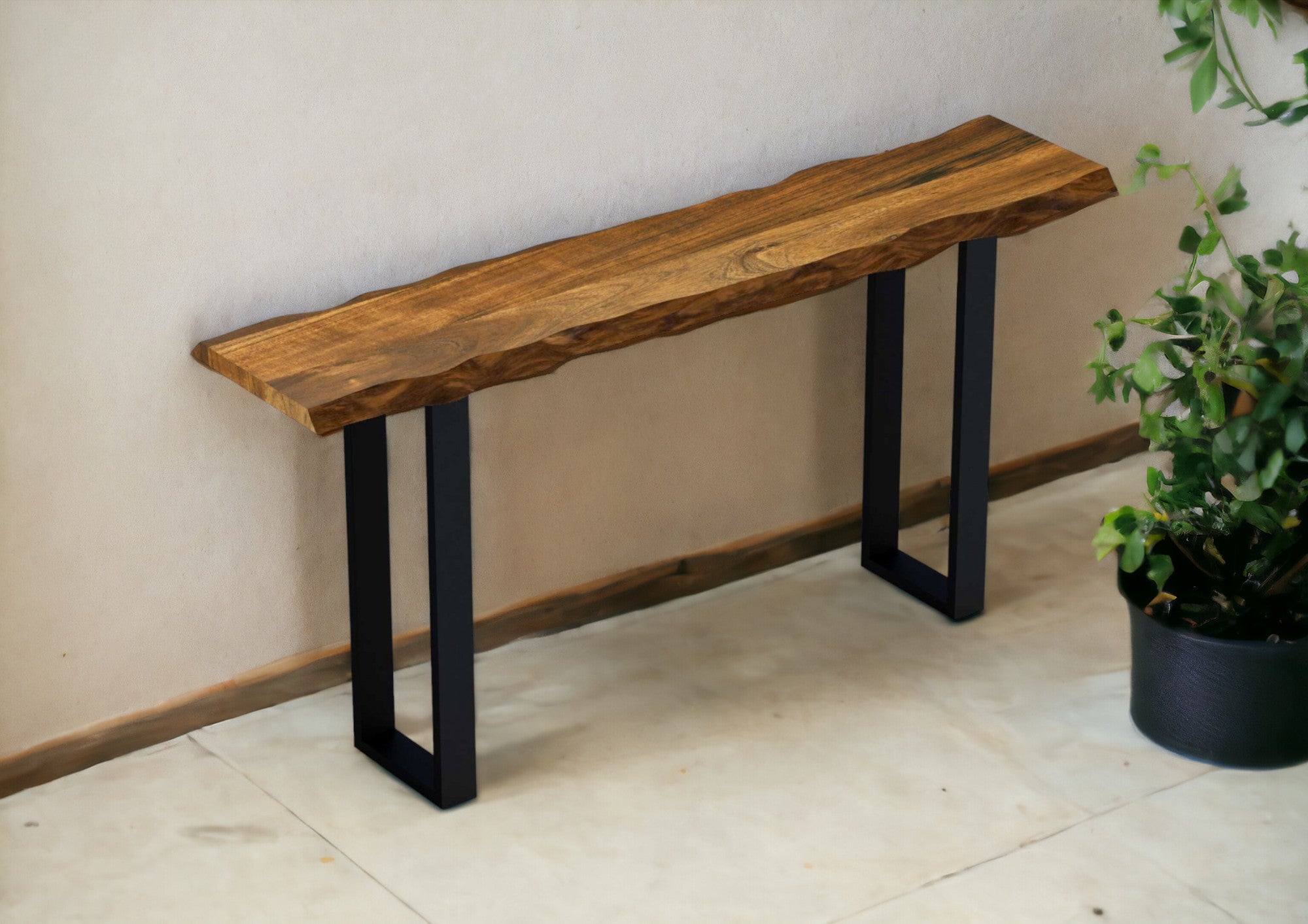 - Solid wood top features a rustic cut live edge that gives it an organic look and feel.