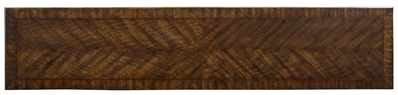 Invite global-inspired glamour into your entryway or living room with a striking console that blends geometric modernity and warm walnut tones. The Melange Presidio Console Table pairs a gold powder-coated metal frame with rich walnut veneers for a sophisticated accent piece that’s both decorative and functional—featuring an open shelf for display or storage and a finished back for versatile placement.