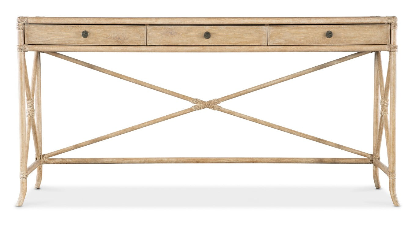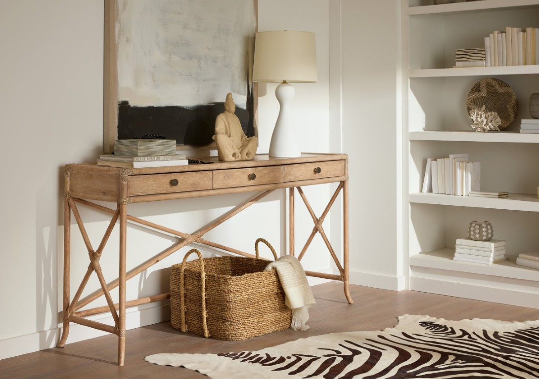 Bring the relaxed elegance of a coastal retreat into your entryway or living room with this handcrafted console. The Retreat Pole Rattan Console combines warm oak and maple veneers in a bamboo motif, rope accents, and an airy Dune finish to create a light, textured piece that reads both casual and refined. Thoughtful details — from X-design stretchers to soft pewter hardware and three self-closing drawers — make it as functional as it is decorative, and it’s finished on all sides so it can float in a room or sit against a wall.