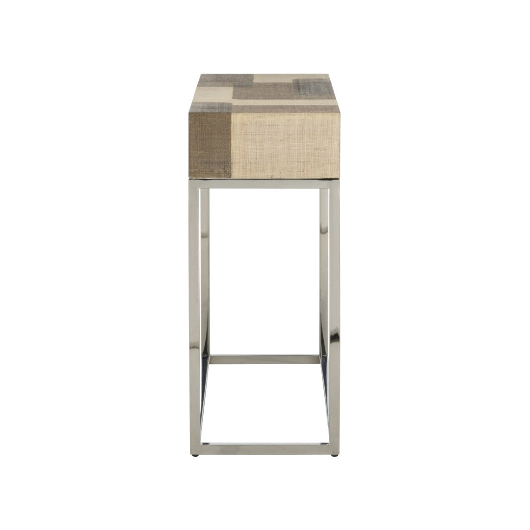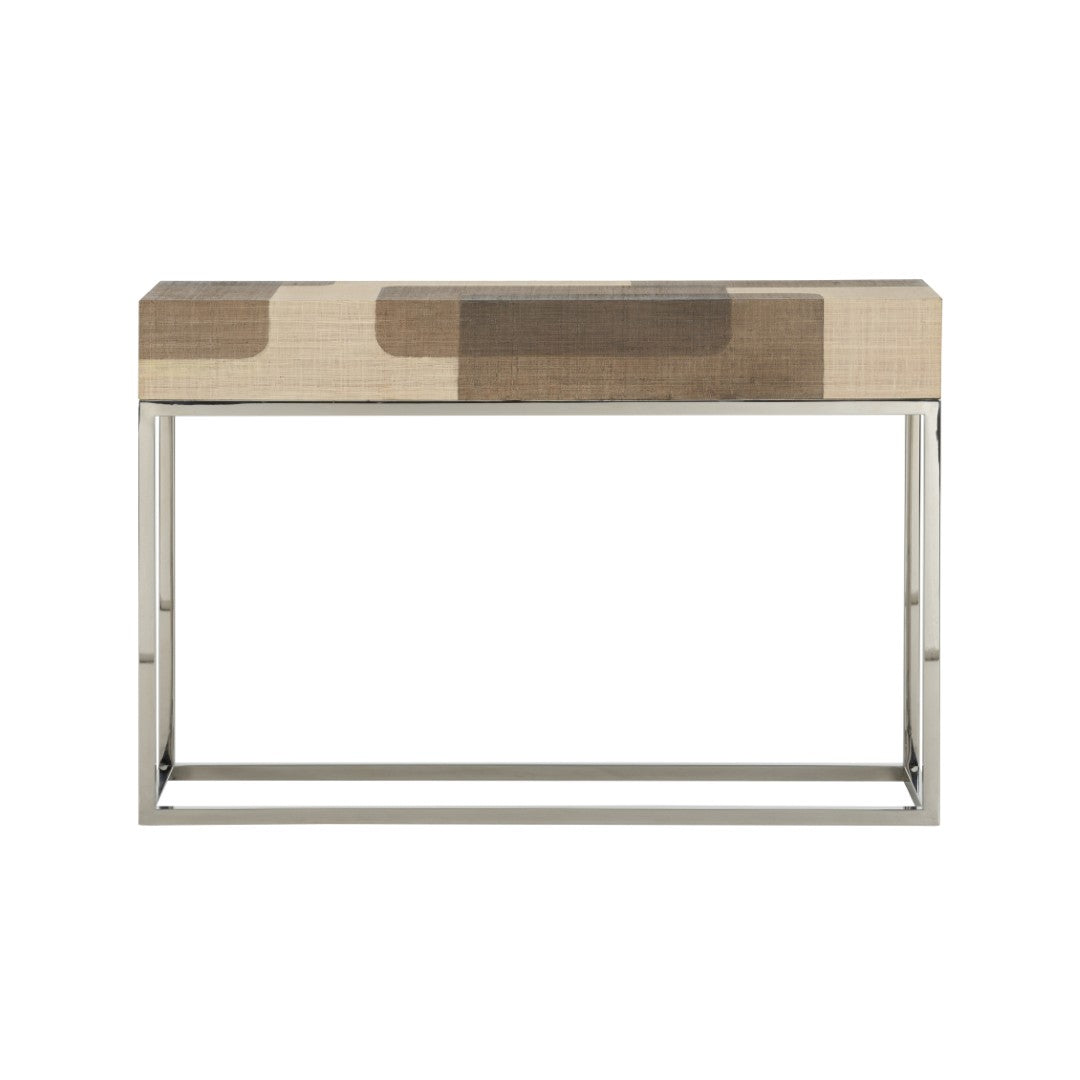 Elevate your entryway or living room with the Jacoby Console — a refined blend of natural texture and modern metallic shine. Its geometric raffia pattern and polished nickel frame create a striking focal point that complements both contemporary and transitional interiors, while the warm brown and cream tones add depth and organic warmth.