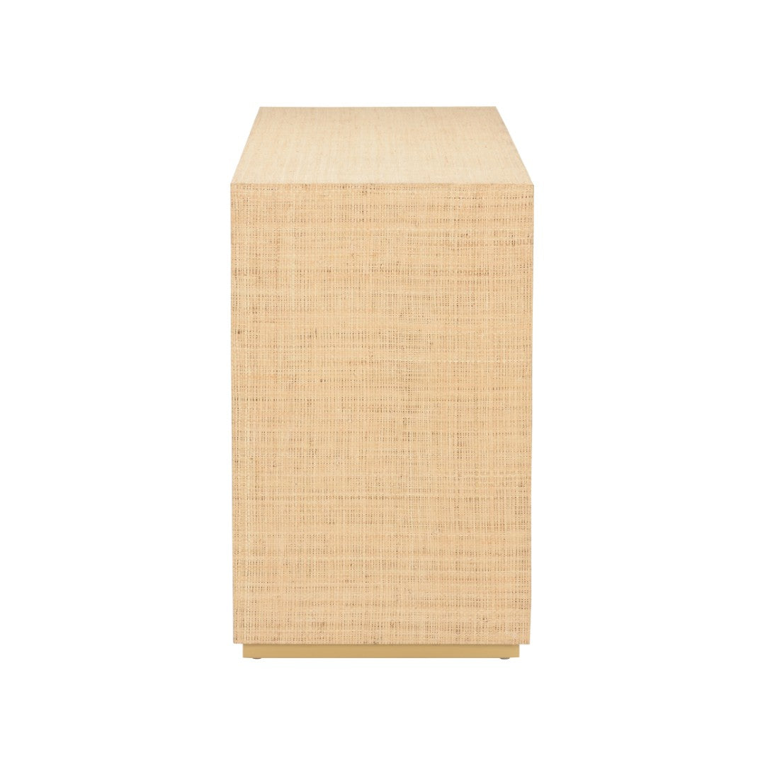 - Materials & Finish: Natural raffia top and apron provide textural warmth contrasted by a polished brass base for a subtle metallic accent