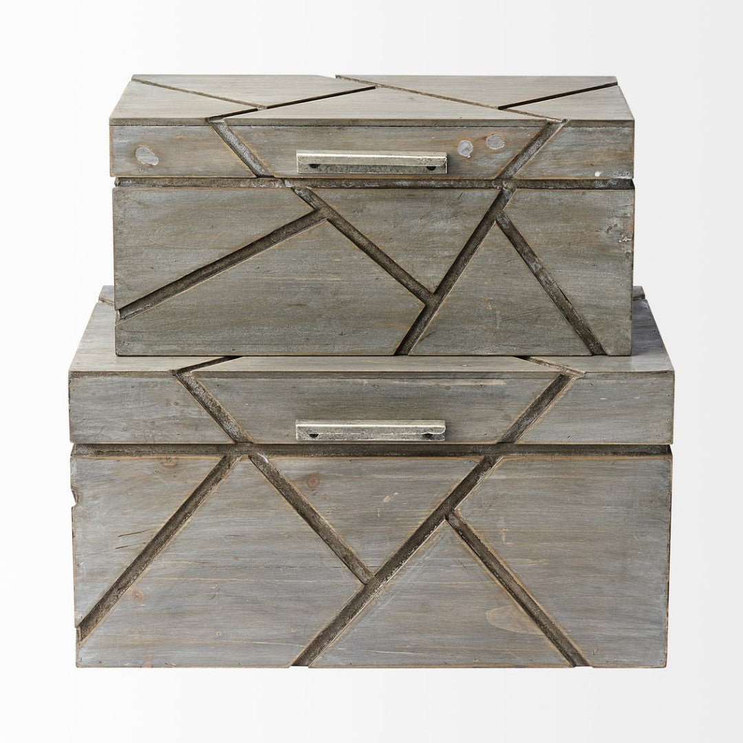 Add refined storage and sculptural interest to any room with this handcrafted pair of wooden nesting boxes. Finished in a soft light gray, the Niobe set blends modern farmhouse and coastal aesthetics with luxe, urban loft appeal—perfect for displaying accents, corralling small items, or stacking as a compact decorative statement.