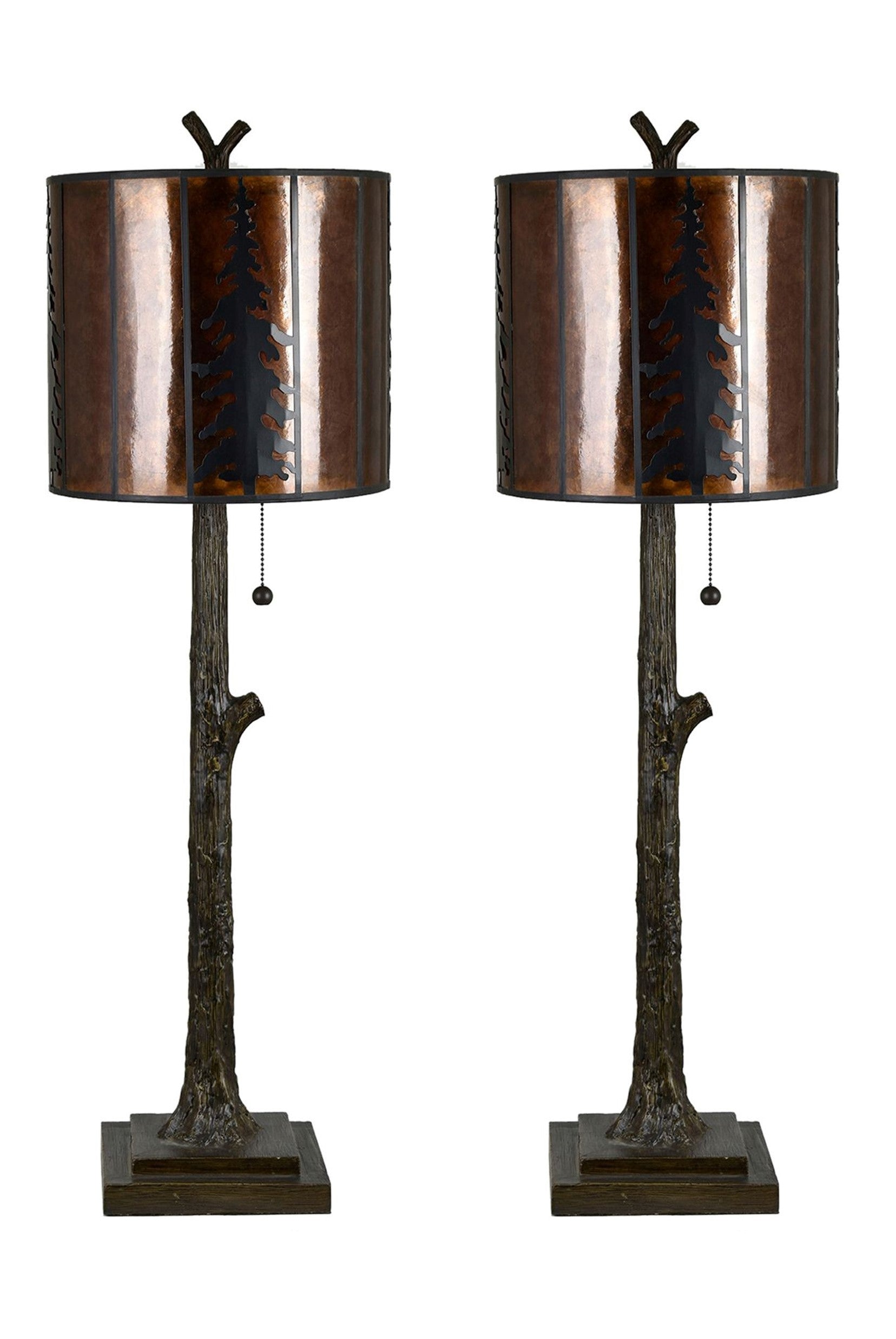 - Amber mica shade featuring intricate pine tree silhouettes and a metal-framed overlay of horizontal lines