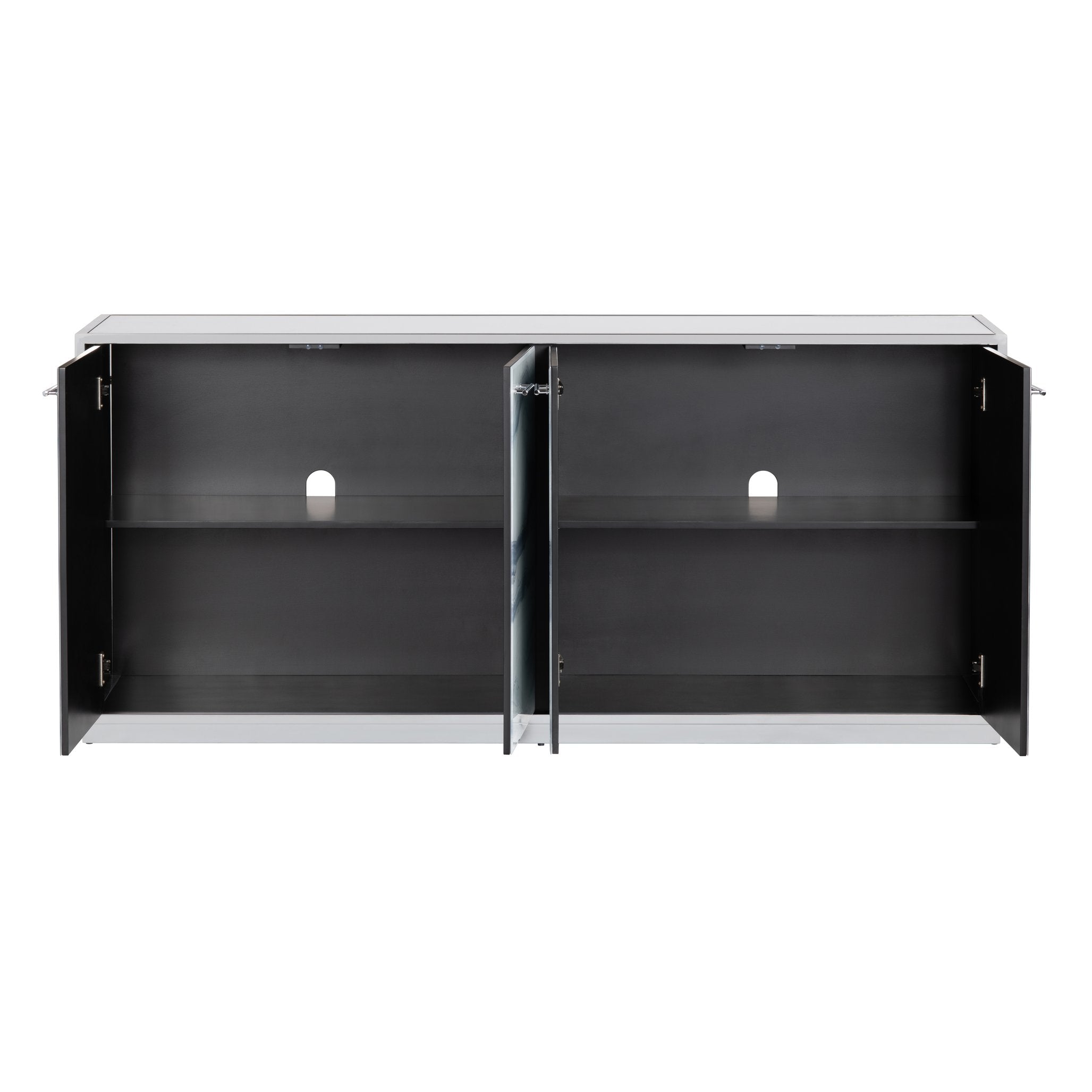- This four-door media credenza features a fluid, wave-like pattern on the doors for a modern and artistic touch