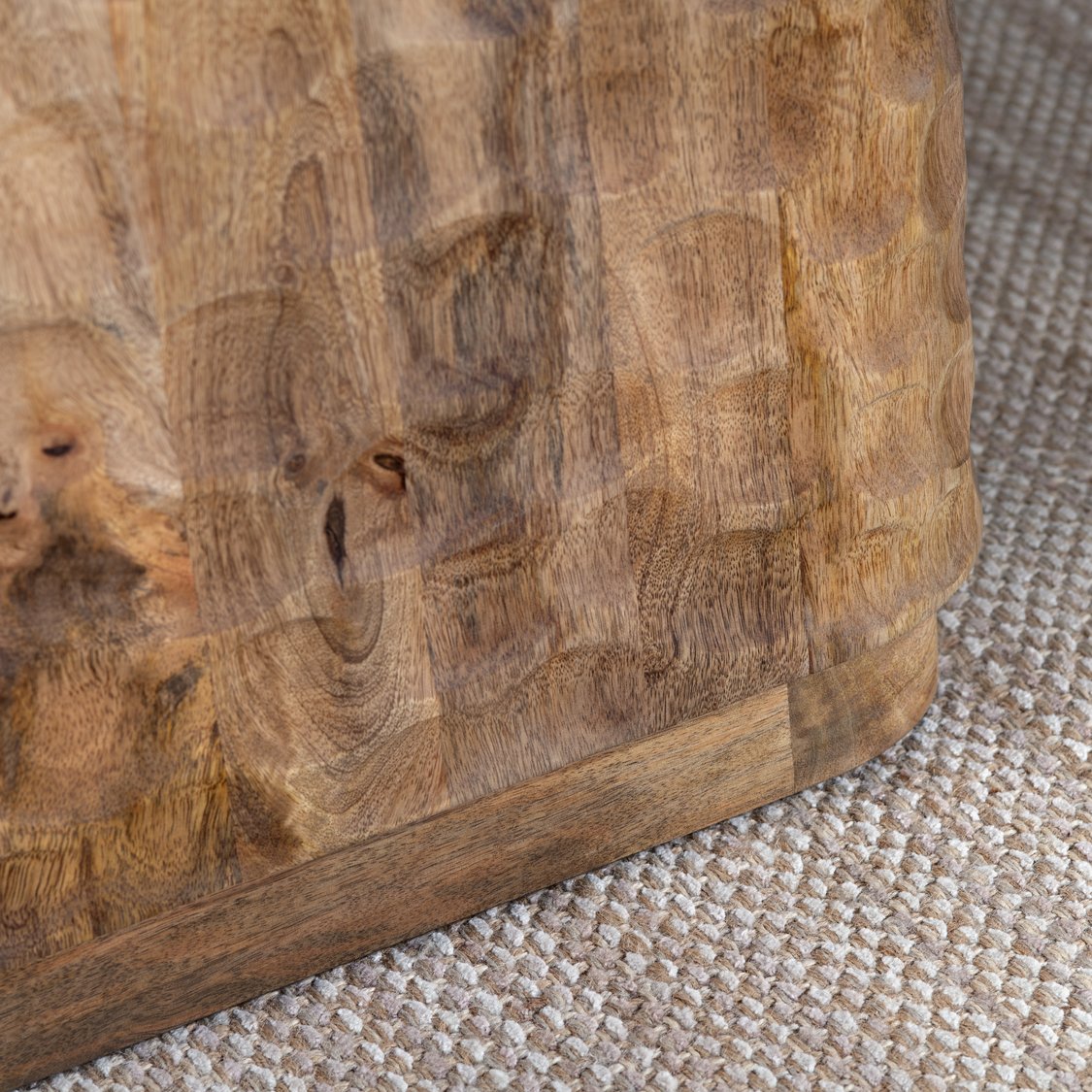- Crafted from solid mango wood, this cocktail table showcases durability and natural beauty with its rich grain and organic texture