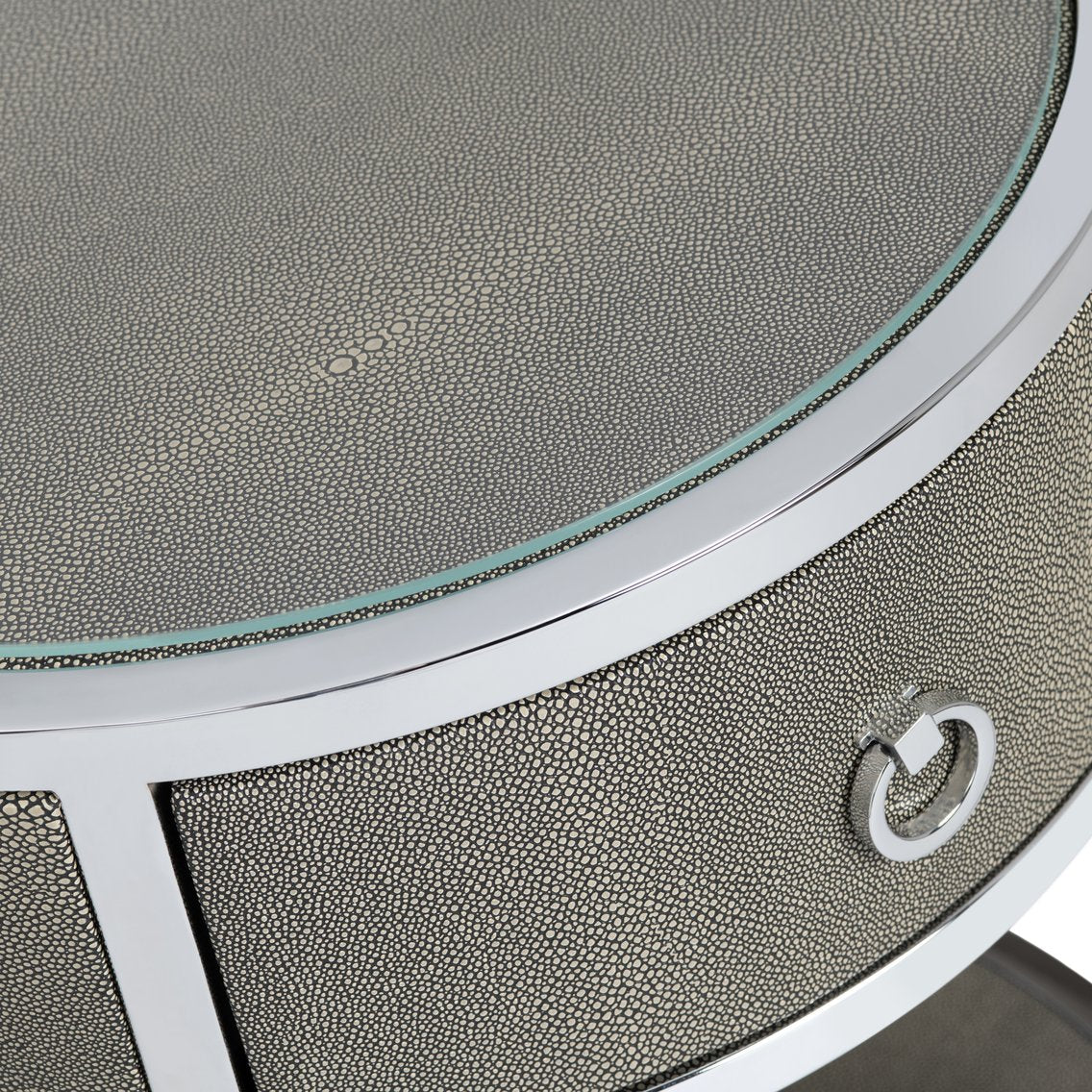 - Single pull-out drawer with a chrome drop ring and smooth metal glide for easy access