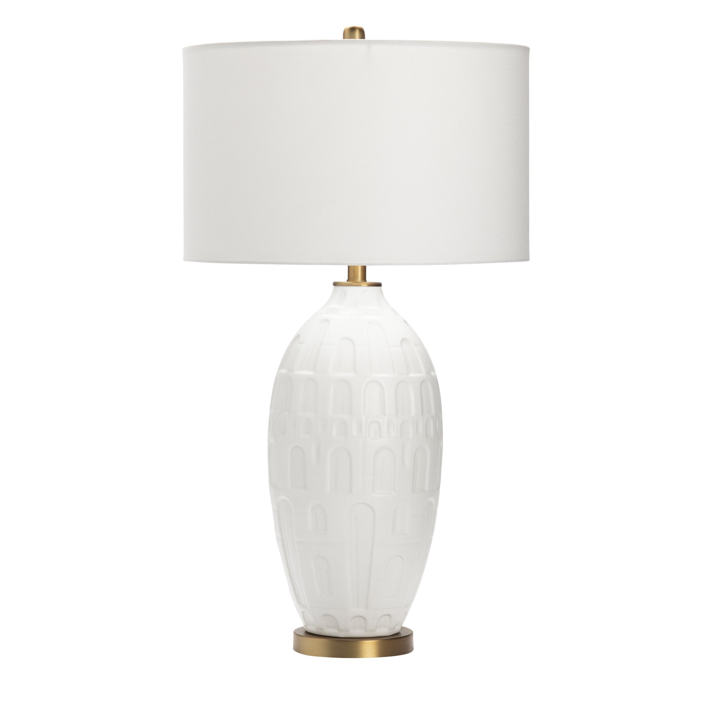 - Topped with a white linen drum shade featuring rolled edges