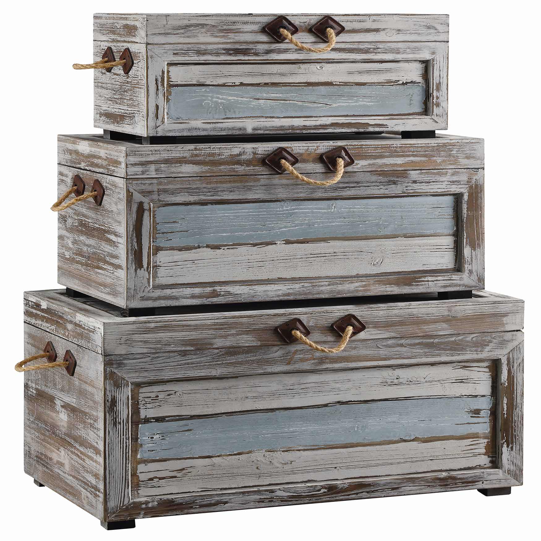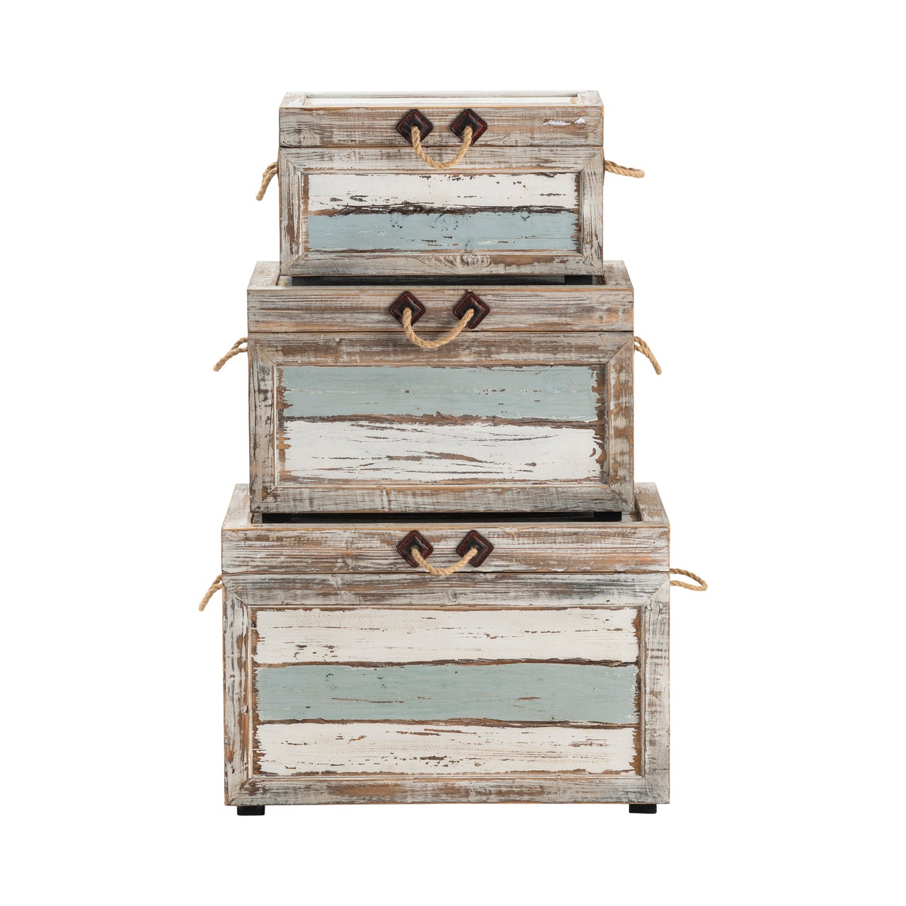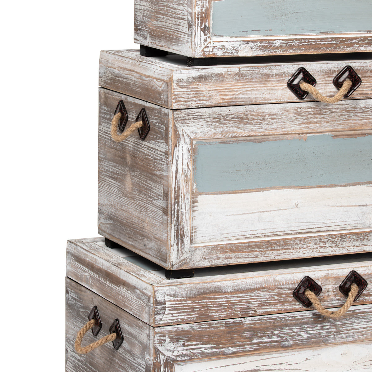 This set of Crestview Collection Nantucket Weathered Wood Trunks comes in a light gray wood finish and gentle weathered blue and pale white accents. They are delightful as a stacked display in your home, or individually any place you'd like storage with a coastal flair. Rope handle details add to the beachy look, enjoyable for beach lovers and landlubbers alike. Cheery and functional all in one.