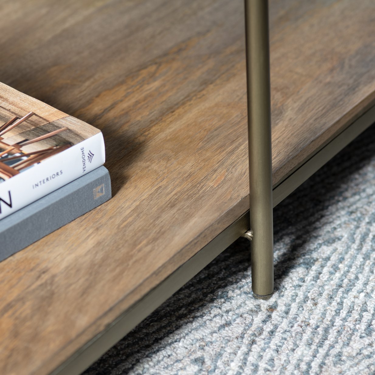 - Powder-coated iron legs in a sophisticated gold finish add a refined contrast