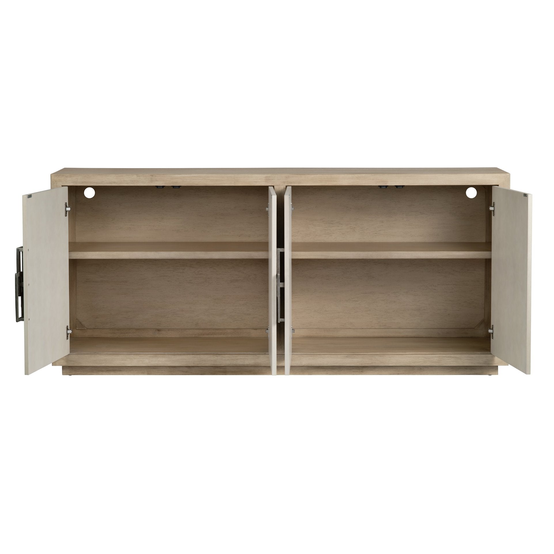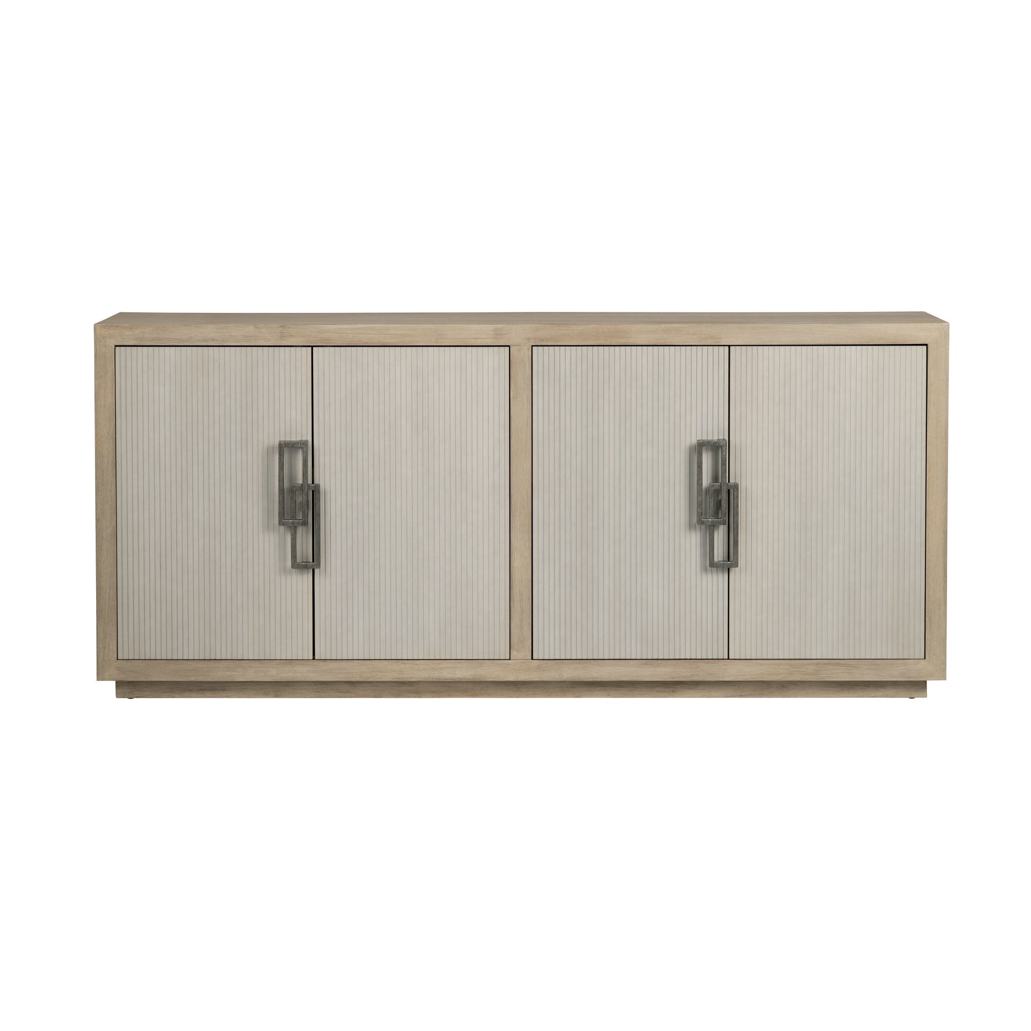 - Four wooden doors showcase vertical grooves, adding depth and visual interest