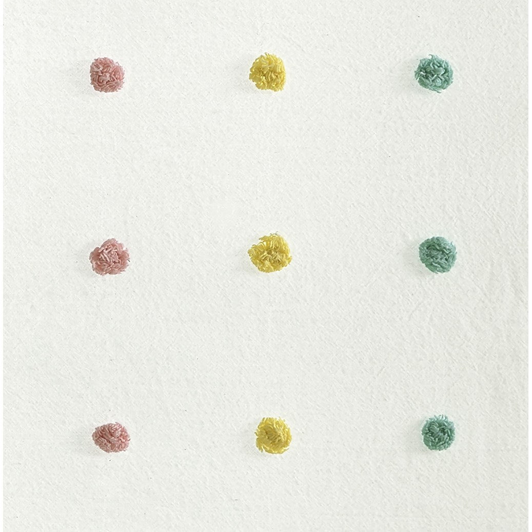 - Design: Multi-colored jacquard pom poms on a soft white ground for a playful, textured appearance