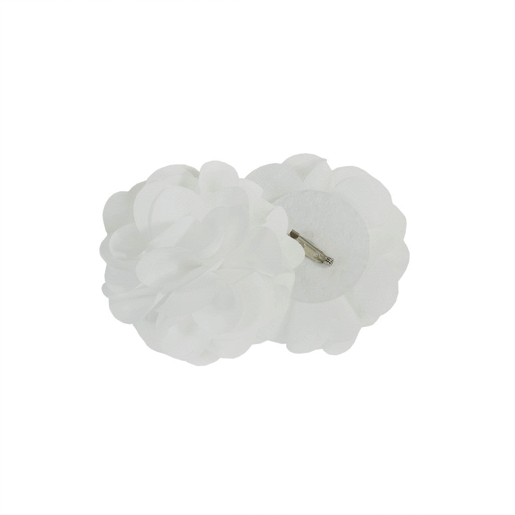 - Design: Solid white semi-sheer panel with removable floral rosette pins for a decorative accent.