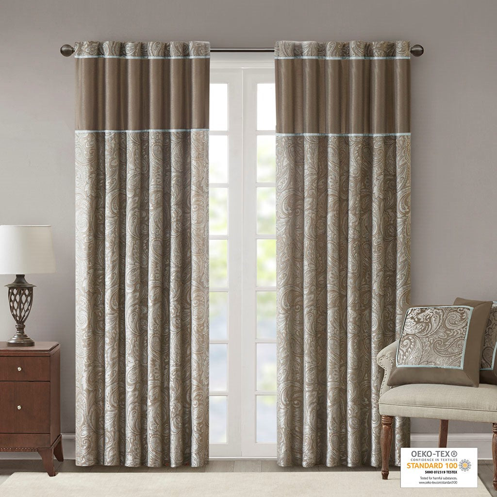 Elevate your living space with these elegant jacquard window panels that blend timeless paisley-inspired design with modern functionality. Woven in rich blue and taupe tones with subtle platinum highlights, the panels bring depth and a soft shimmer to any room. Detailed with faux silk piecing and gold flat piping, they provide a refined, coordinated look while meeting OEKO-TEX standards for safety and comfort. Easy to hang and operate, these panels are ideal for bedrooms, living rooms, or formal spaces seeking a polished finish.