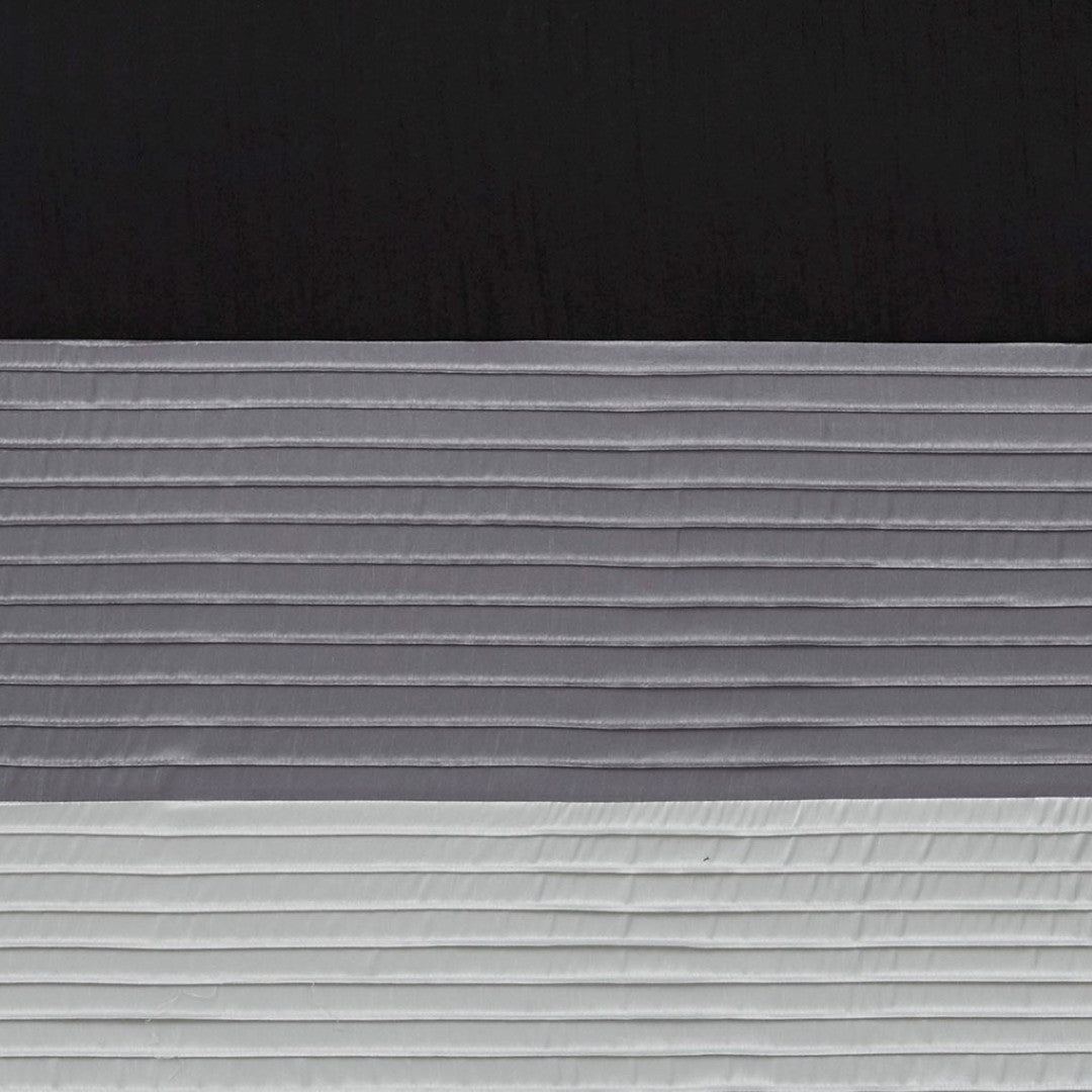 - Design: Modern horizontal/vertical striped motif in black, charcoal, and silver with pintuck detailing for texture and dimension.