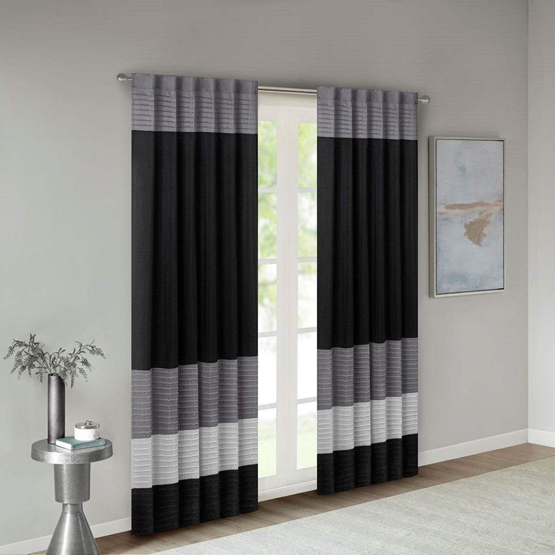 Elevate your window treatments with a contemporary curtain that blends tailored texture and subtle sheen. The Polyoni pintuck panel pairs a modern striped pattern in black, charcoal, and silver with precise pintuck detailing to add depth and visual interest, while the attached lining provides gentle light filtration and enhanced drape for a polished, finished look.