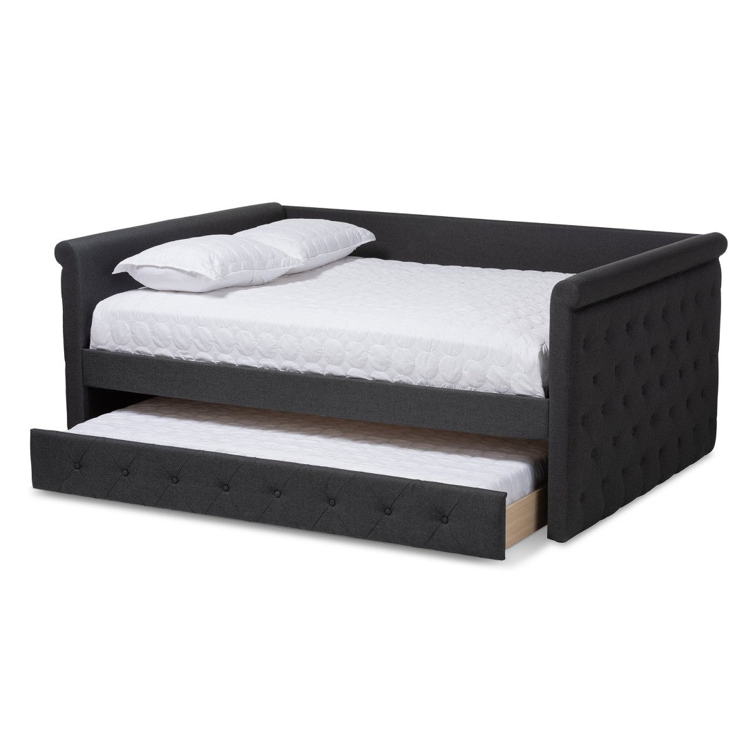 A refined blend of modern lines and classic detailing, this upholstered full-size daybed with pull-out trundle offers stylish seating by day and comfortable sleeping for guests by night. Upholstered in rich dark grey fabric over a foam-padded engineered wood frame, the Alena daybed pairs versatile contemporary design—button-tufted panels and scrolled arms—with practical features for small spaces, guest rooms, or multi-use living areas. Made in Malaysia and requiring assembly, it delivers a luxe look while maximizing sleeping capacity.