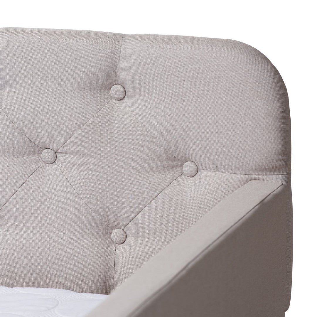 An elegant solution for small spaces, this modern-contemporary daybed combines timeless button-tufted styling with practical functionality. Upholstered in a neutral grey polyester fabric over a foam-padded solid rubberwood and MDF frame, it serves as a comfortable seating area by day and a guest-ready bed by night thanks to its roll-out twin trundle. Designed to maximize utility without sacrificing style, the Camelia is an ideal addition to guest rooms, home offices, or studio apartments.