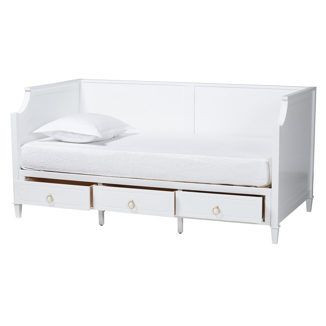 Casual comfort meets classic craftsmanship with this beautifully finished white daybed — designed to serve as a versatile seating area by day and a comfortable twin sleeping surface by night. Thoughtful details like scalloped corners, tapered legs, inset paneling and ring-pull hardware give it a timeless, refined look while three built-in drawers provide generous hidden storage to keep your space tidy.