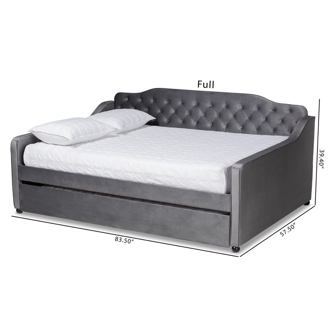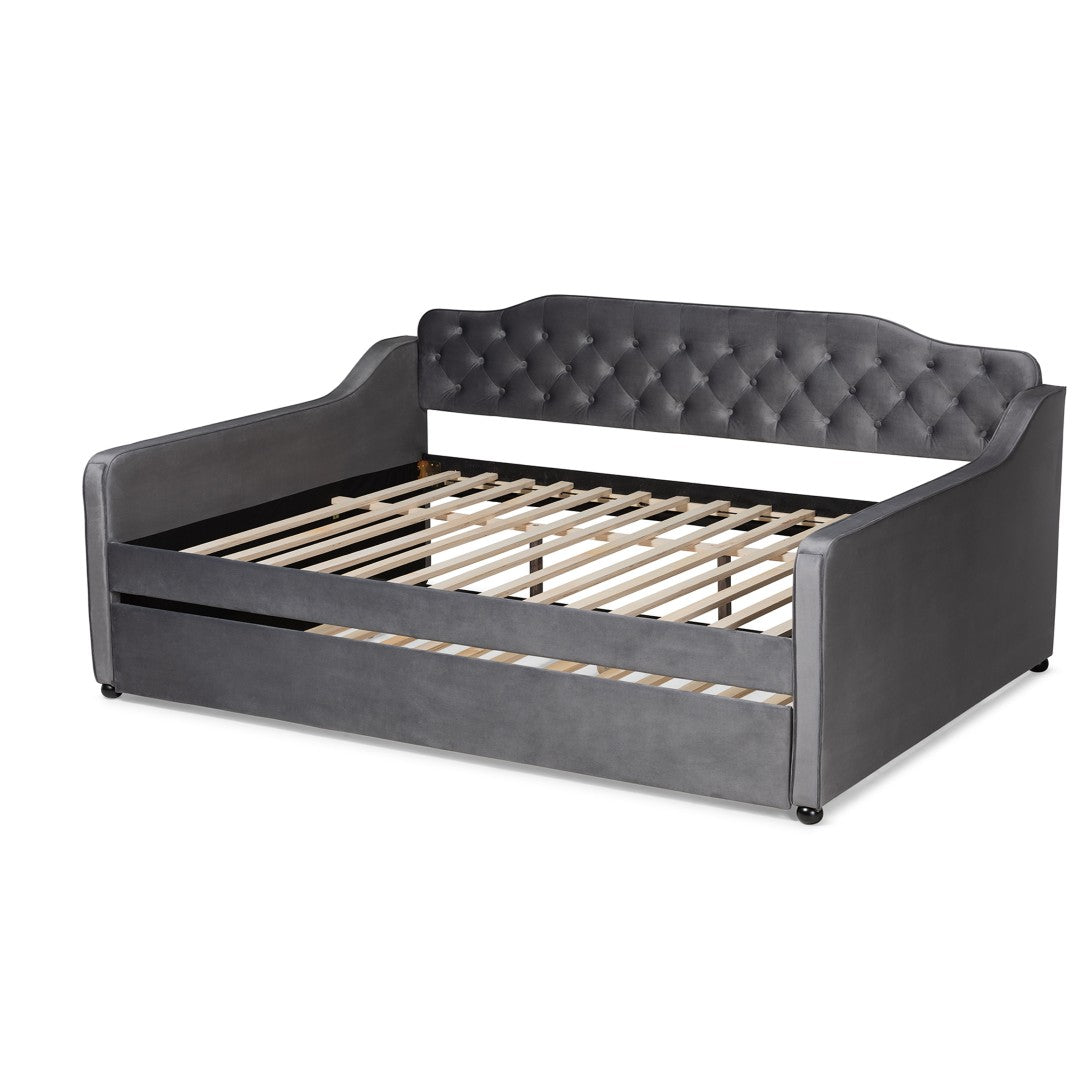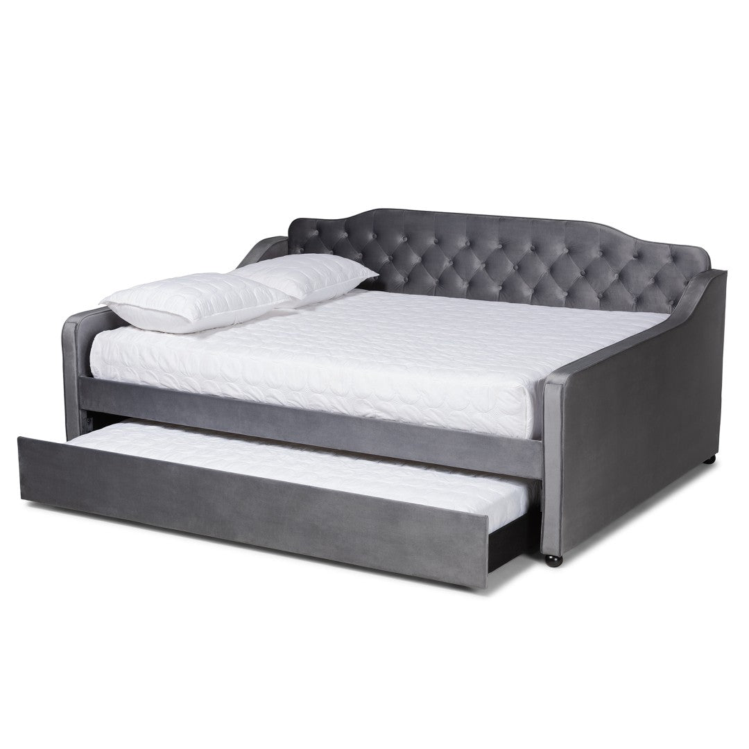 Lounge and host guests in refined comfort with this transitional-contemporary daybed. Upholstered in soft grey velvet and accented with classic button tufting and piping, it combines elegant styling with practical functionality — including a convenient pull-out trundle — to create a versatile sleeping and seating solution for guest rooms, home offices, or living spaces.