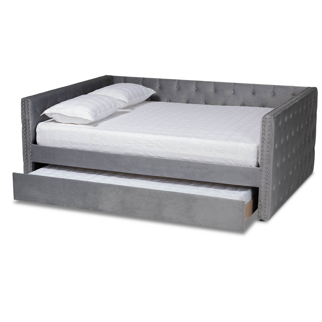 Introduce a refined focal point to your bedroom with this modern velvet-upholstered daybed. Combining elegant detailing—button tufting and silver-finished metal nailheads—with practical design, it offers comfortable seating by day and generous sleeping space by night. The roll-out trundle and wood slat support system make it guest-ready without needing a box spring, while the foam-padded frame and durable velvet fabric deliver lasting comfort and style.