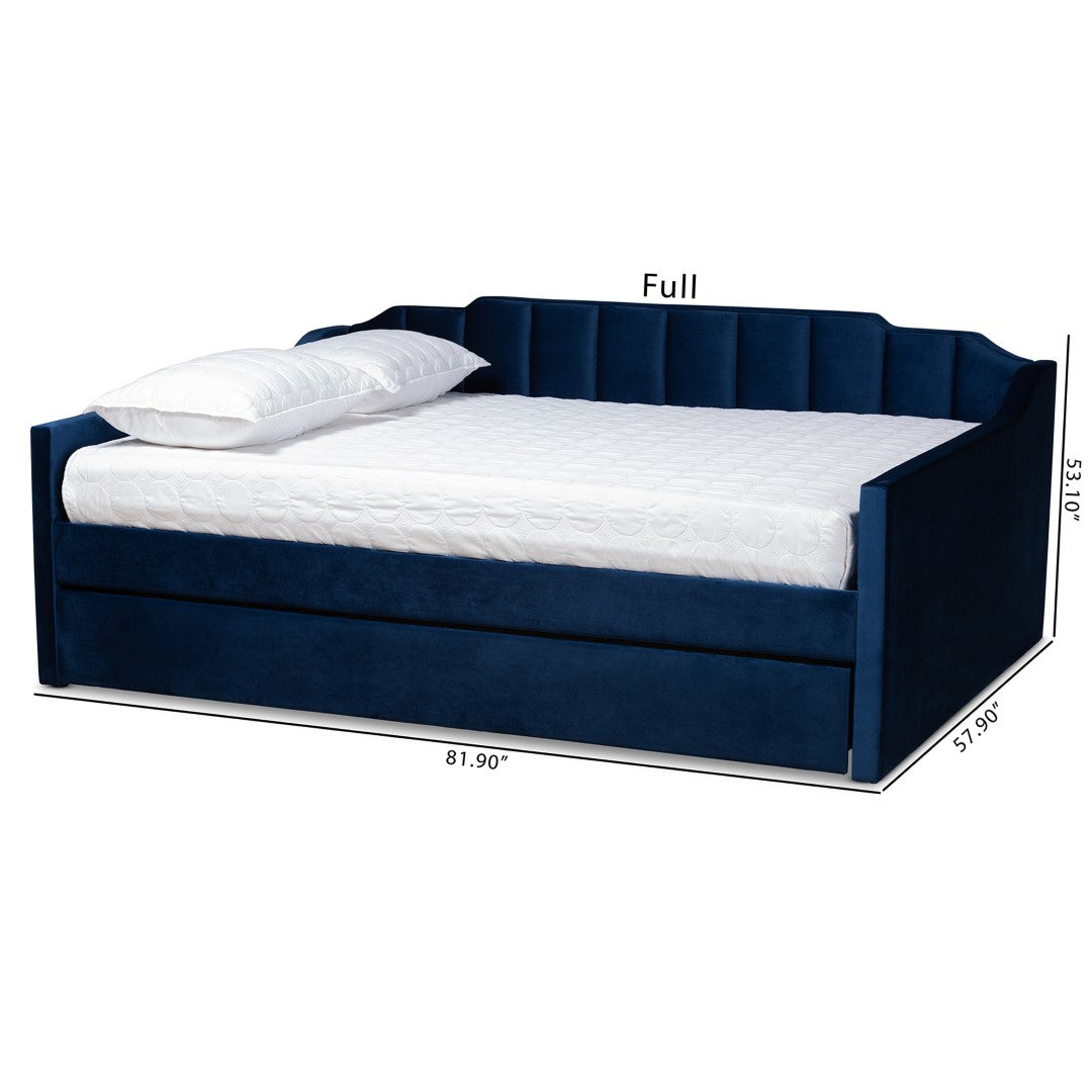 Bring timeless modern style and plush comfort to your guest room or studio with this navy blue velvet daybed. Thoughtfully crafted in Malaysia with a sturdy wood frame and foam padding, it combines channel tufting, rolled arms and stepped detailing for an elegant silhouette. The included twin-size roll-out trundle expands sleeping capacity without sacrificing floor space, making this daybed a versatile solution for everyday lounging and overnight guests.