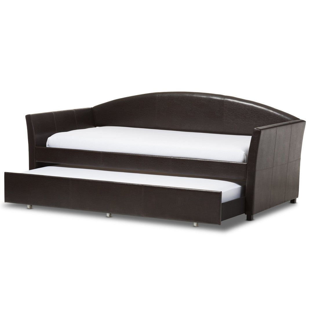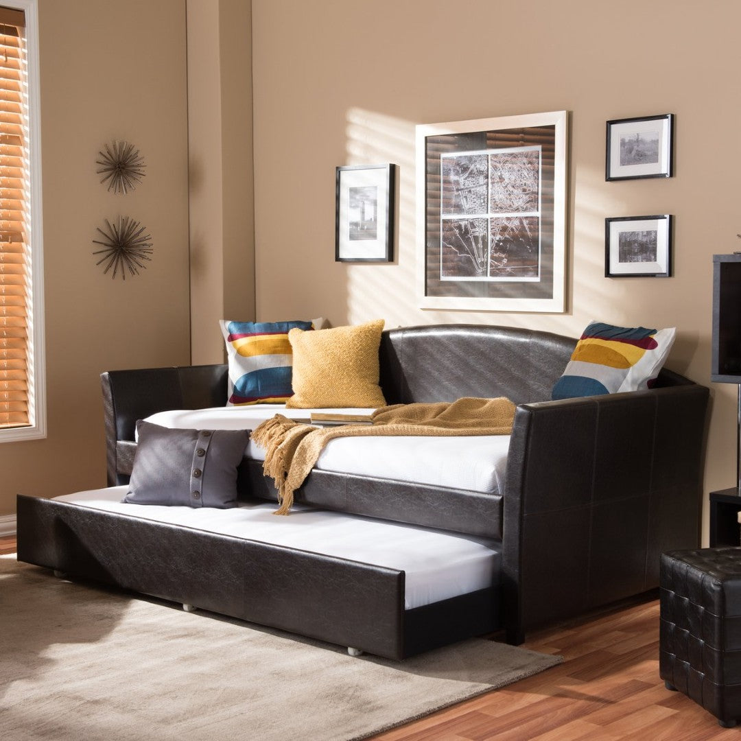 A stylish, space-saving solution for guest rooms, studios, or home offices, this modern arched-back daybed combines the look of an upholstered sofa with the function of a twin bed and a roll-out trundle. Finished in brown faux leather with tailored stitching, gently flared arms and a graceful arched back, it offers comfortable seating by day and two sleeping surfaces by night—perfect for sleepovers, overnight guests, or compact living spaces. Solid rubberwood construction and foam-padded upholstery deliver durability and comfort, while the included trundle maximizes sleeping capacity without sacrificing style.