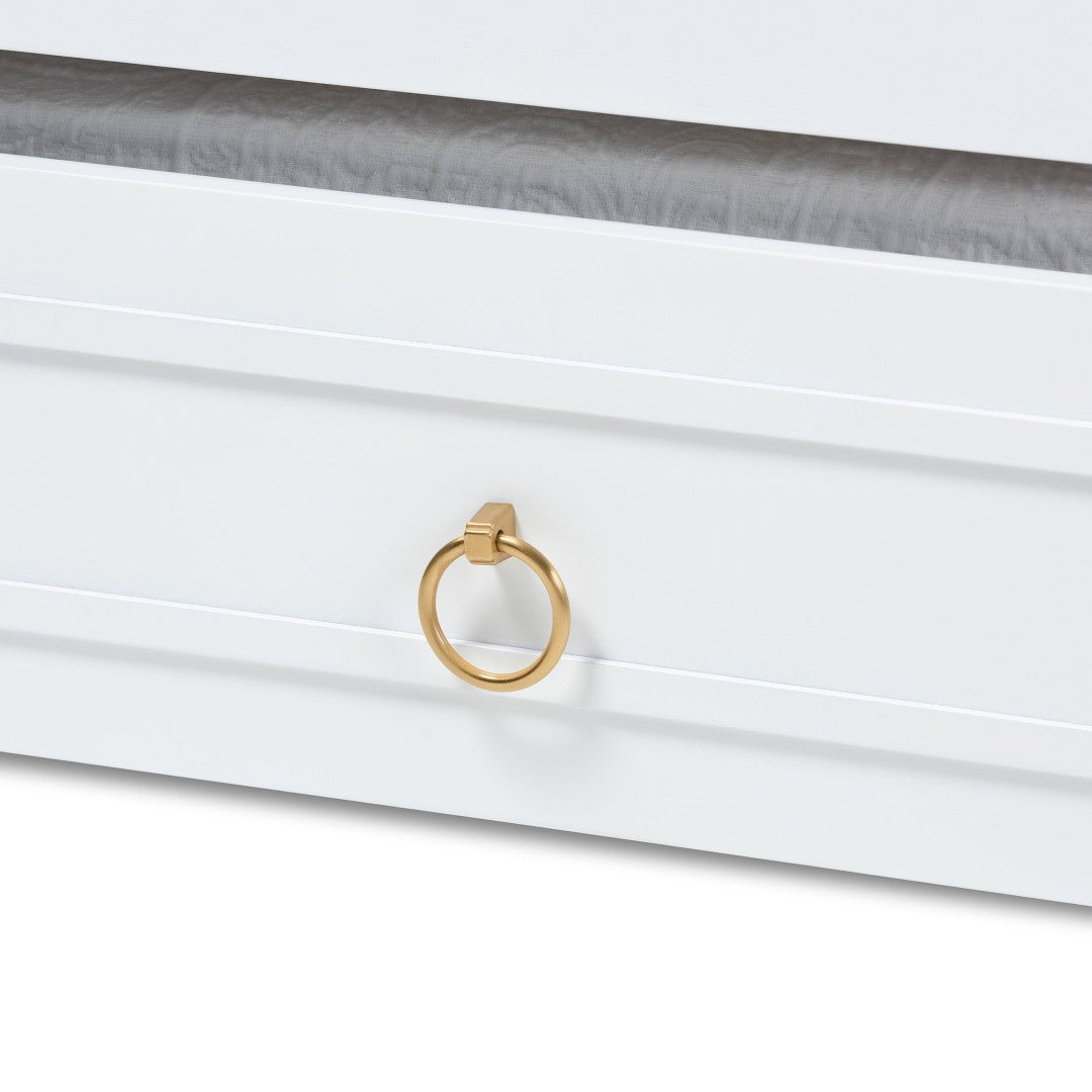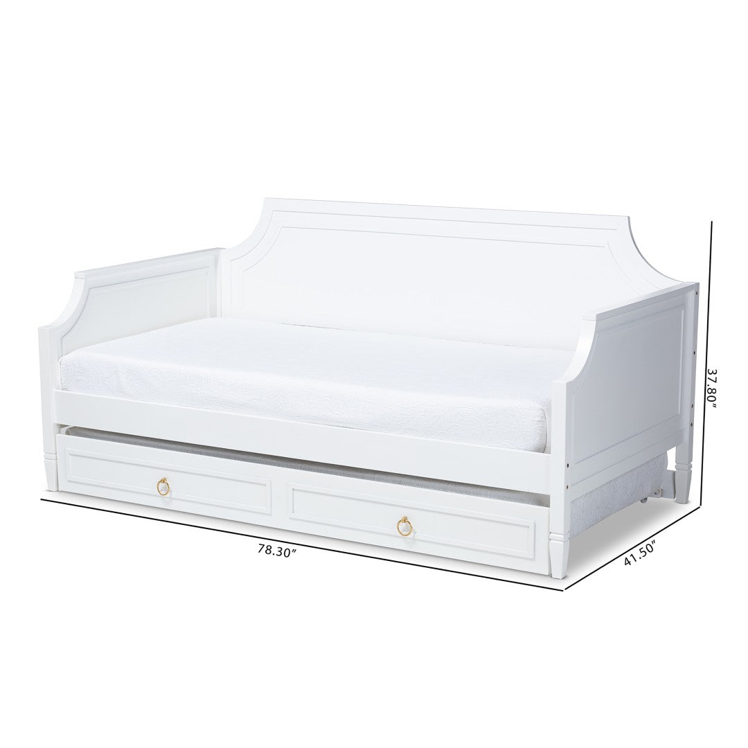 Create a versatile and elegant sleeping and seating solution with the Mariana daybed. Its classic white finish, decorative raised-molding panels and gold-tone ring pulls deliver a refined, timeless look that suits traditional and transitional interiors. Designed for everyday lounging and overnight guests, the included pull-out trundle maximizes sleeping capacity without sacrificing style.