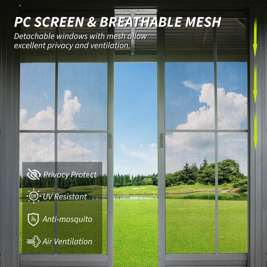 - Premium PE Screens: The sunroom gazebo features high-quality PE screens that provide excellent insect protection, effectively keeping harmful insects out and ensuring your privacy. Durable and UV-resistant, the PE material maintains its color and integrity over time, allowing you to enjoy every sunny day worry-free.