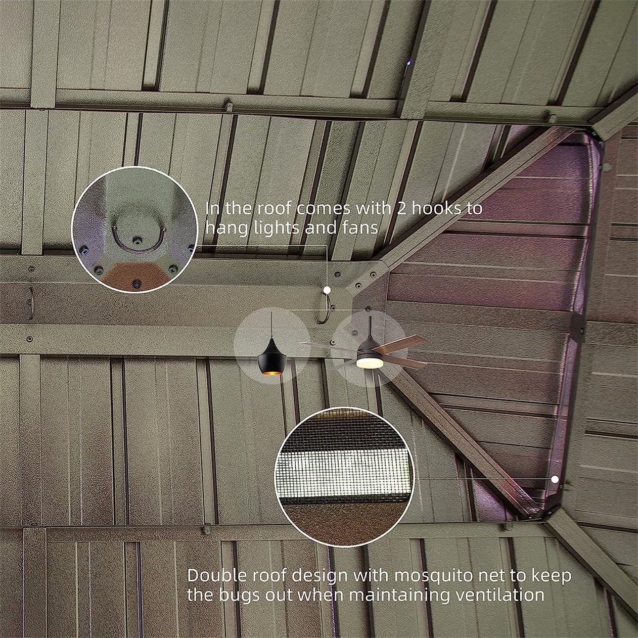 - GALVANIZED STEEL DOUBLE ROOF: W12ftxL16ft(144inchx192inch), Fade-resistant and rust-resistant galvanized steel top, keeps out bright light and harmful UV rays, strong enough to withhold windy or heavy snow. which is not possible with traditional soft top gazebos.