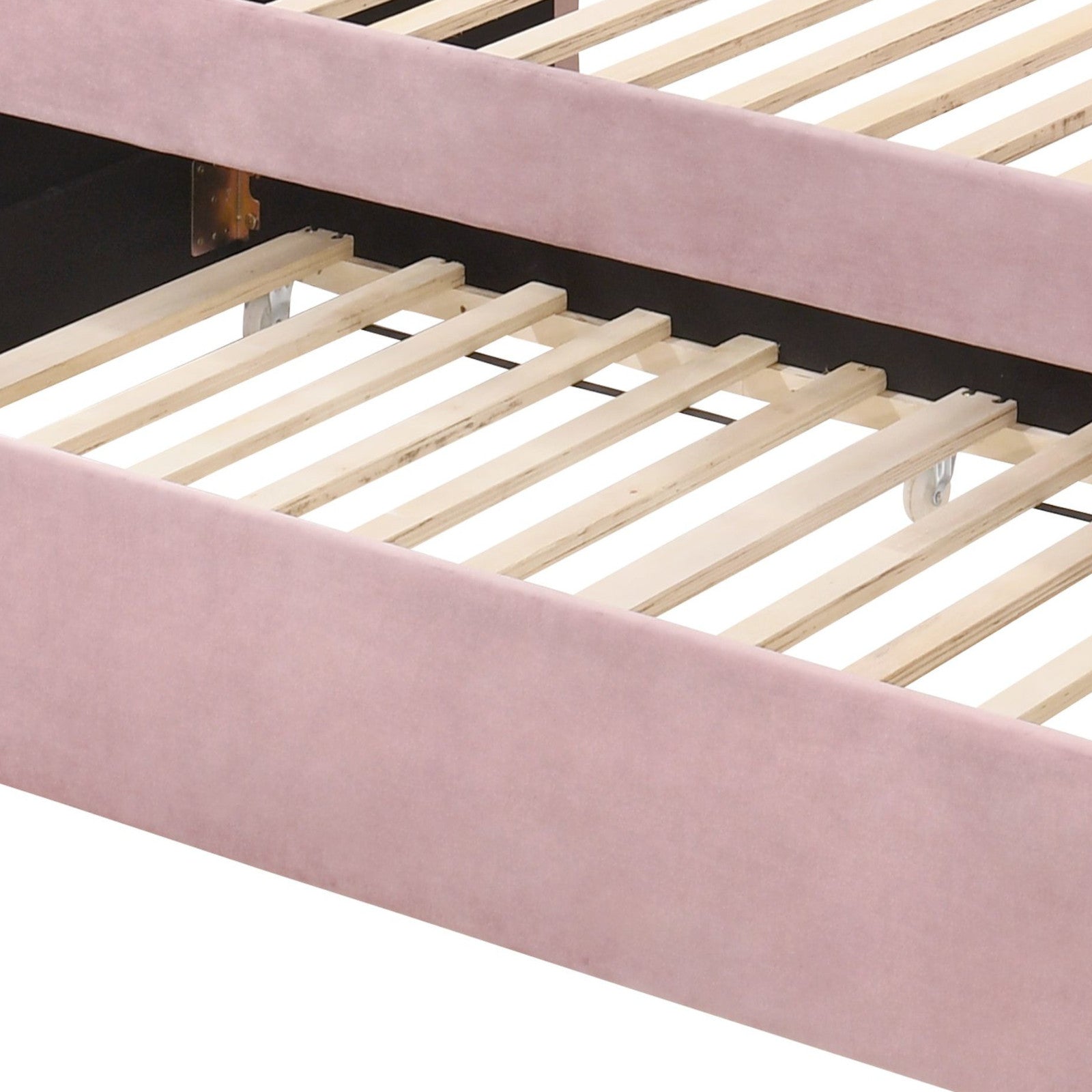 Add a touch of vintage charm and modern comfort to a bedroom or guest space with this pink velvet daybed and twin trundle. Its fully upholstered frame, button-tufted back, and nailhead trim provide an elegant focal point while the included trundle expands sleeping capacity without sacrificing style. Ideal for a child's room, teen space, or cozy guest area, the design balances sturdy construction with soft, luxe upholstery.