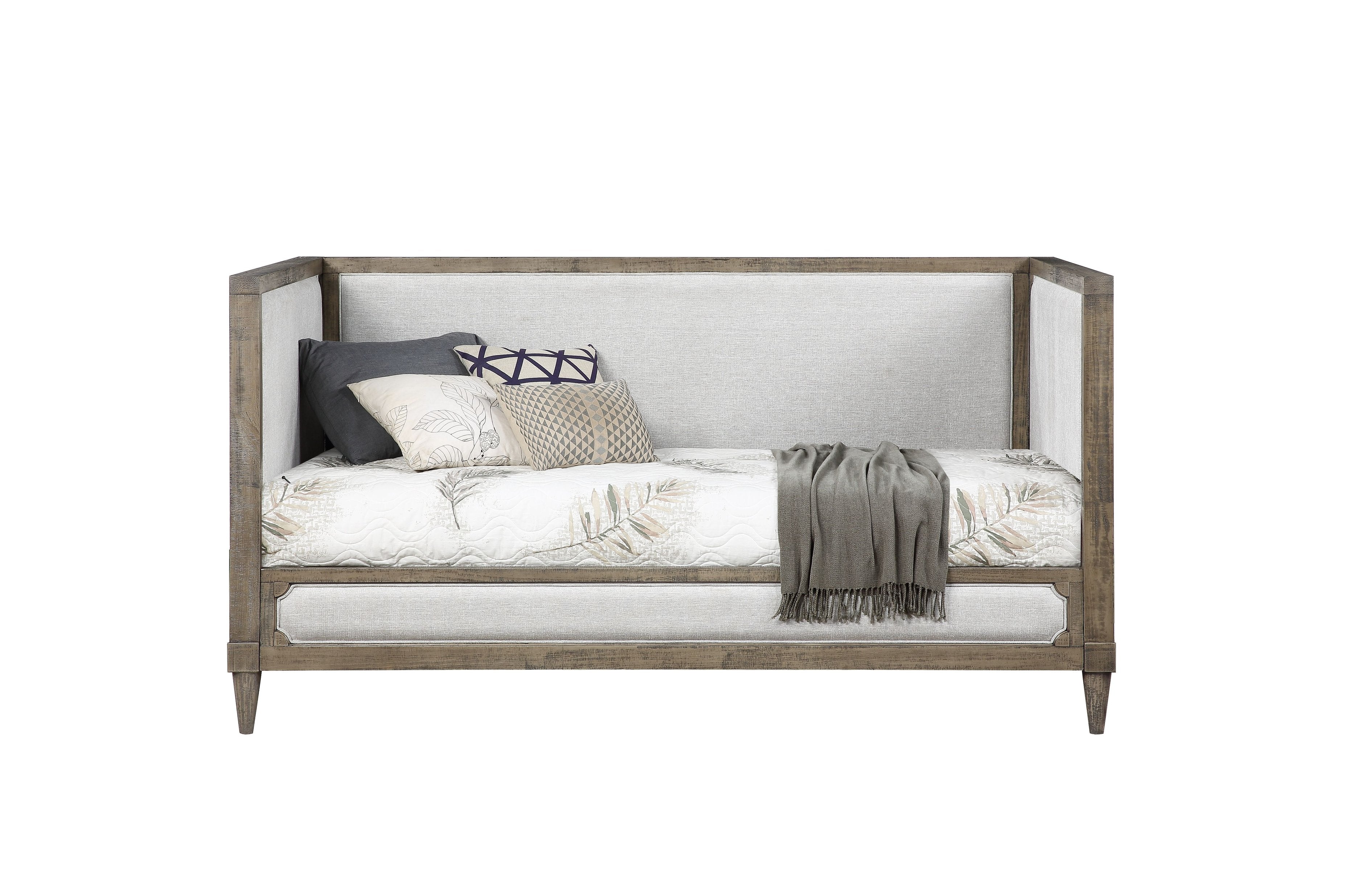 This finely crafted daybed combines classic elegance with practical support, making it an ideal addition to guest rooms, home offices, or compact living spaces. Upholstered in warm tan fabric and finished in a salvaged natural tone, it pairs decorative detailing with durable construction for a refined, everyday piece.