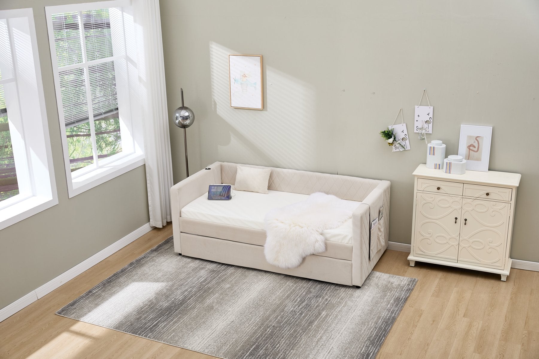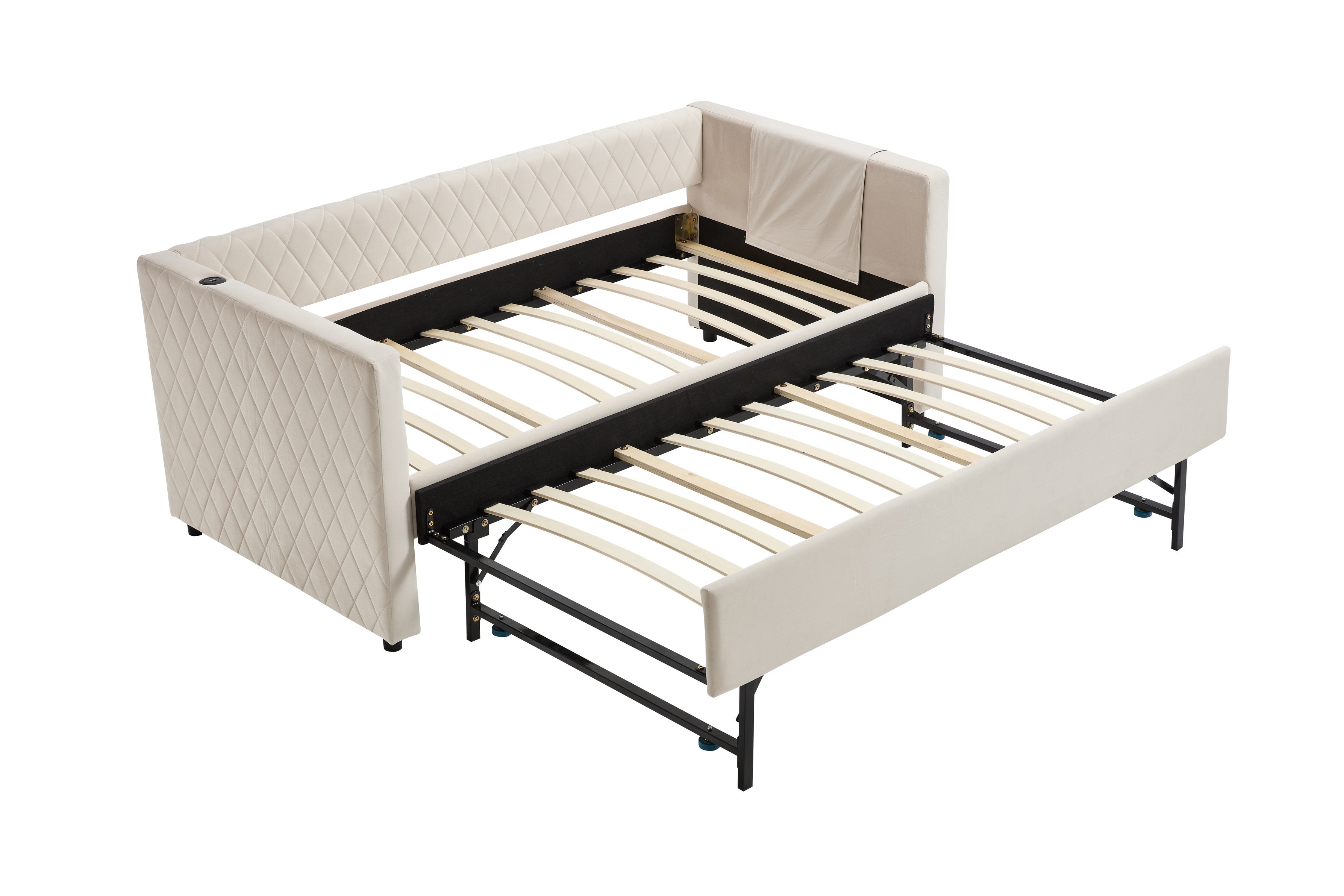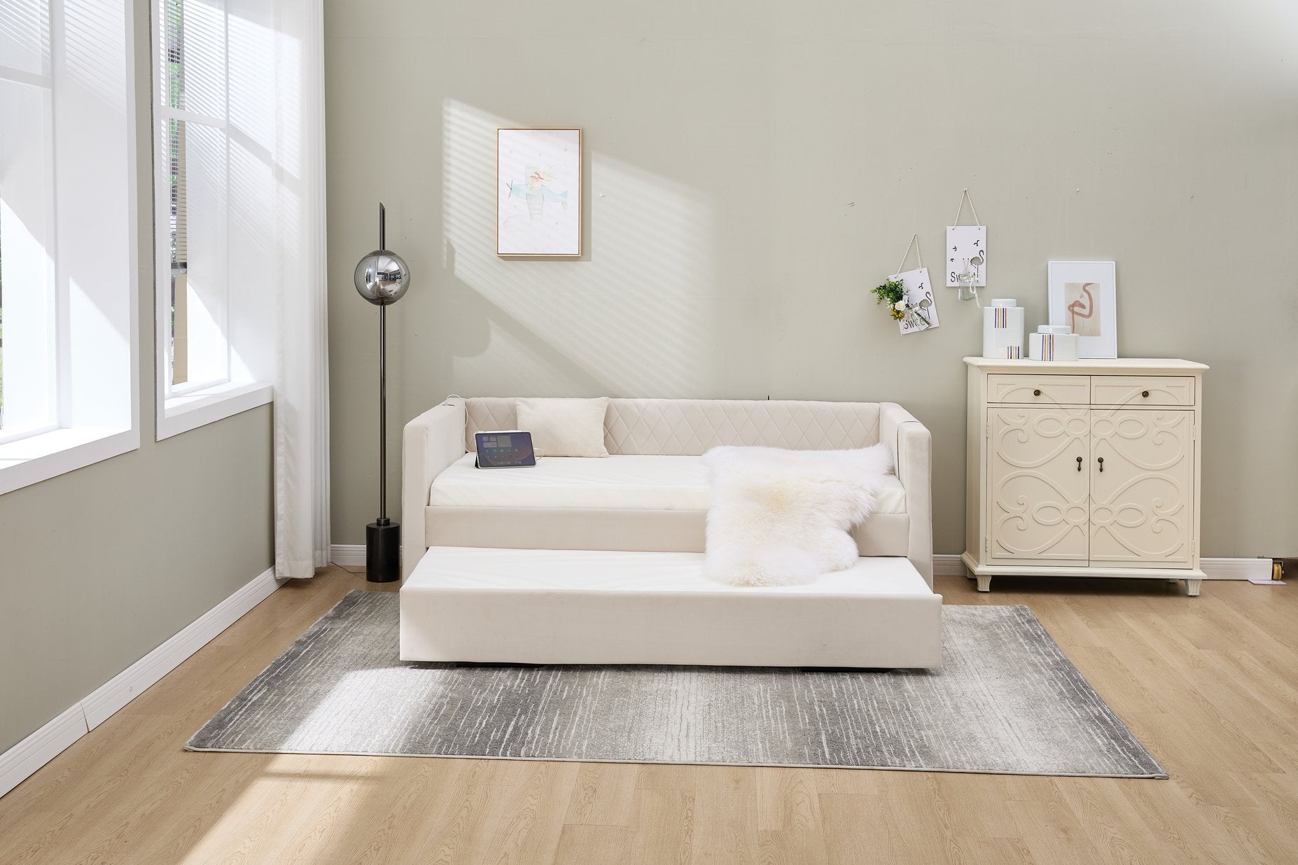 Elevate your living or sleeping space with this elegant beige velvet daybed — a refined blend of soft luxury and practical design. Featuring a modern diamond-grid tufted back and a smooth pull-out trundle, it offers stylish seating by day and comfortable sleeping accommodations by night. Crafted with a sturdy wooden frame and plush velvet upholstery, this versatile piece suits bedrooms, guest rooms, or living areas and arrives ready for simple assembly.