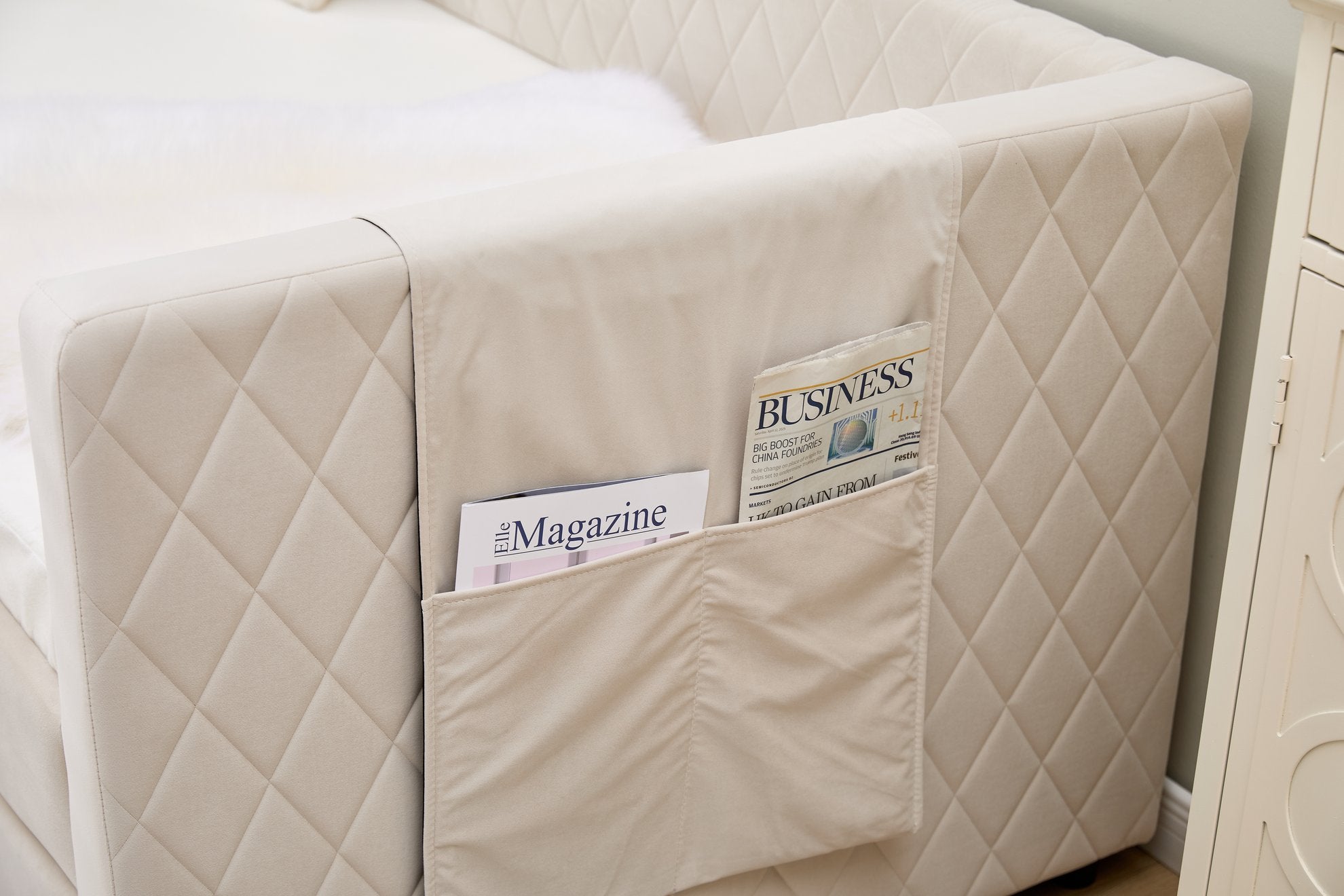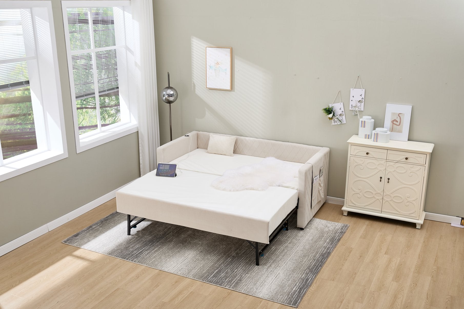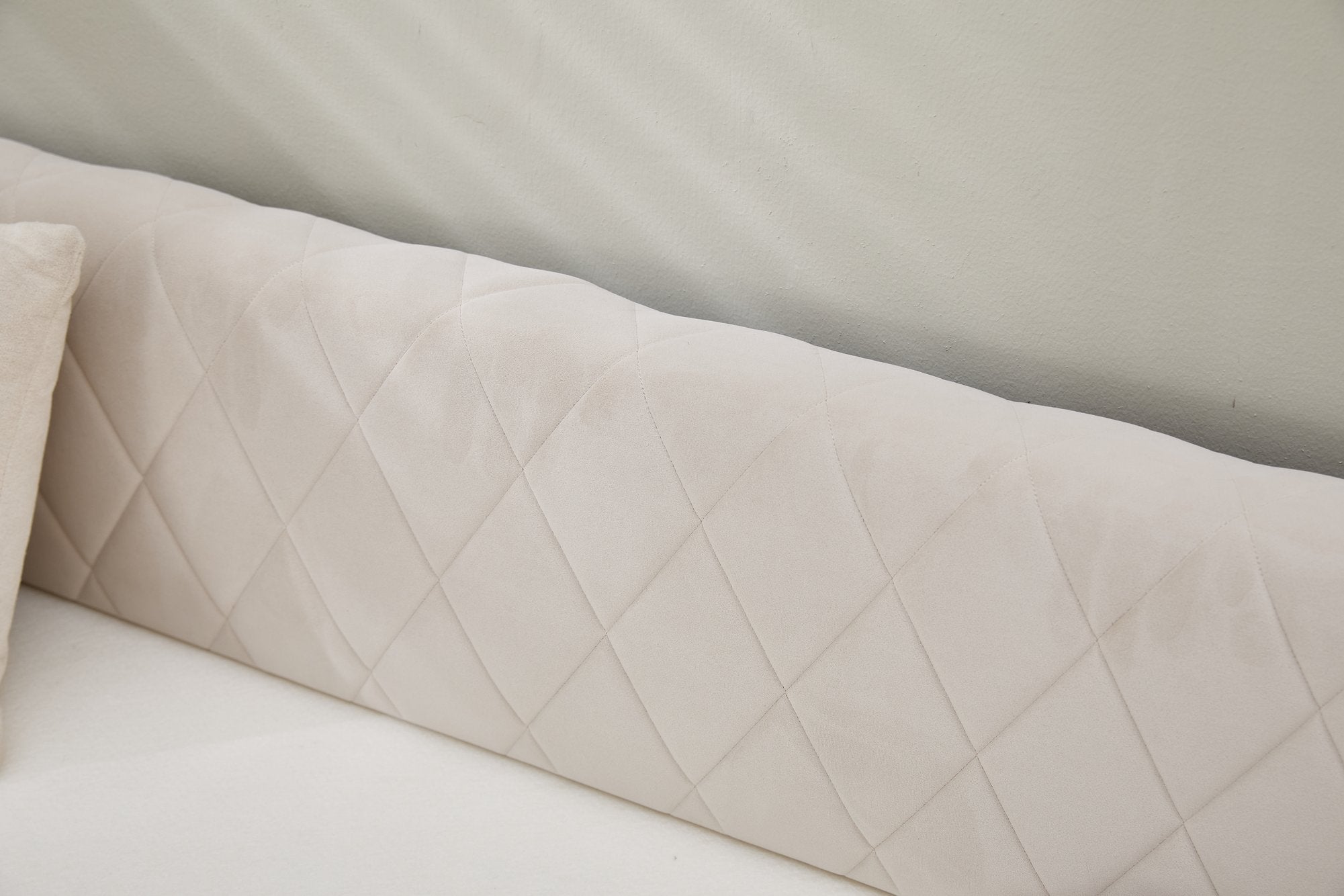 Elevate your living or sleeping space with this elegant beige velvet daybed — a refined blend of soft luxury and practical design. Featuring a modern diamond-grid tufted back and a smooth pull-out trundle, it offers stylish seating by day and comfortable sleeping accommodations by night. Crafted with a sturdy wooden frame and plush velvet upholstery, this versatile piece suits bedrooms, guest rooms, or living areas and arrives ready for simple assembly.
