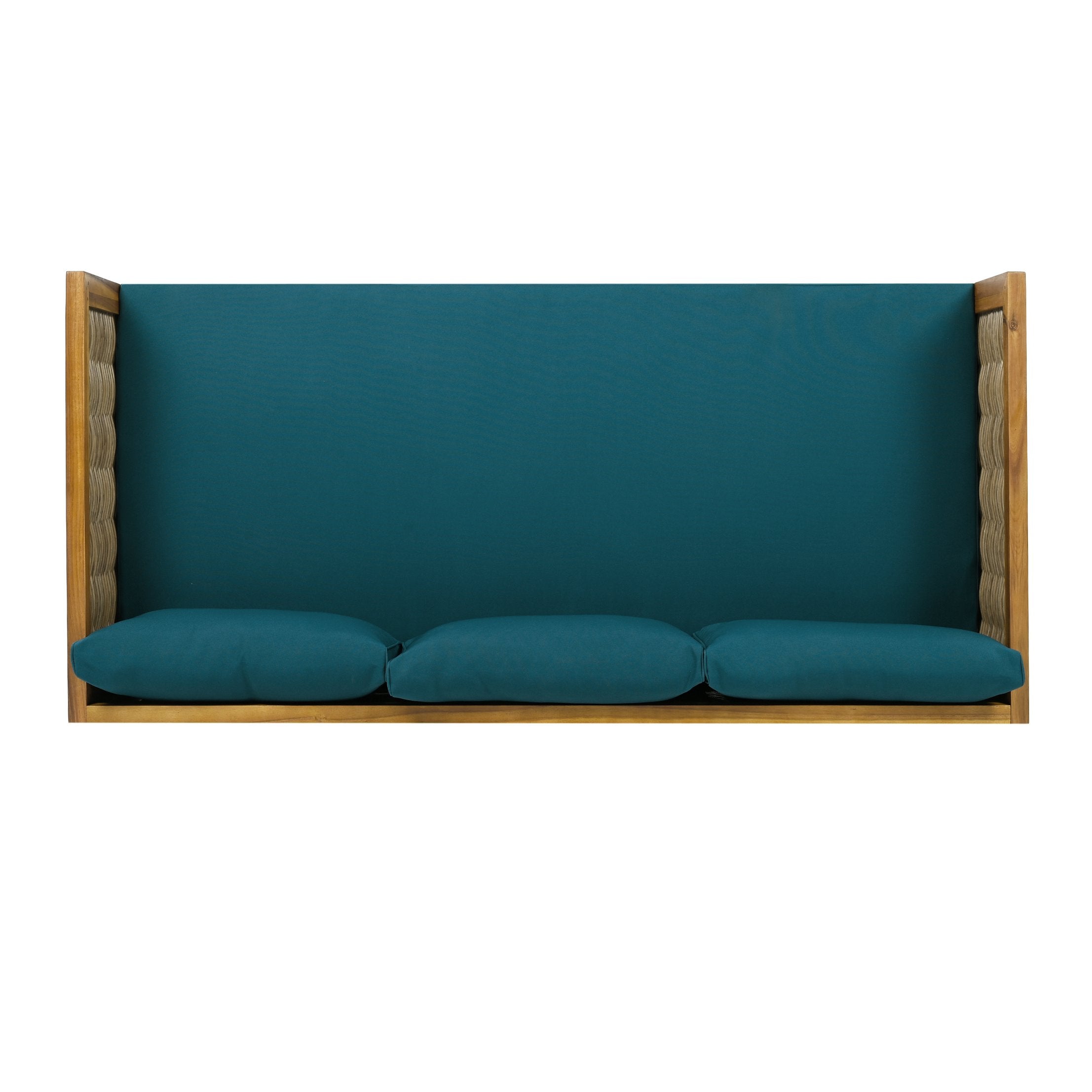 Bring relaxed, resort-style comfort to your patio or sunroom with the Claremont 3-Seater Daybed. Crafted from durable acacia wood and detailed with woven rattan armrests, this piece balances sturdy construction with airy, natural charm. Plush, water-resistant cushions in teal complete the look for a cozy, inviting seating area that works indoors or outdoors (cushions are water-resistant, not waterproof).