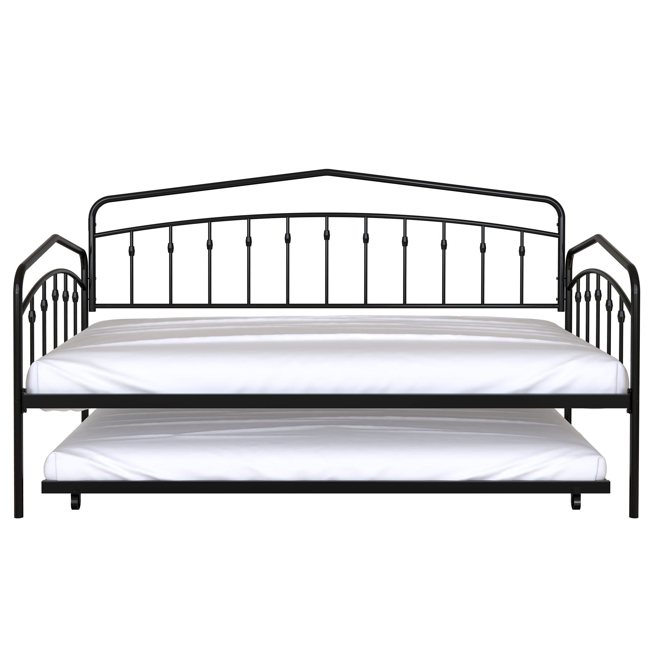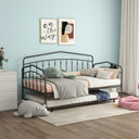 This sleek and space-saving black metal daybed with a twin trundle combines modern style with practical functionality—ideal for guest rooms, kids’ rooms, or compact living spaces. Sturdy construction and thoughtful design deliver a quiet, comfortable sleep surface while the roll-out trundle provides an instant second bed without taking up extra room when not in use.