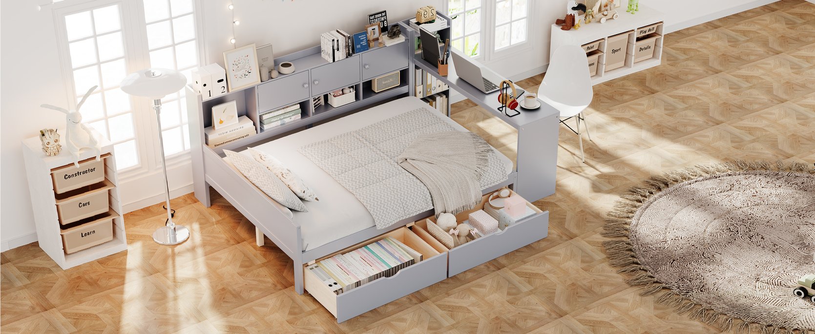 Maximize your living area with this versatile L-shape daybed that combines a full-size sleeping surface, generous storage, and a dedicated study nook. Thoughtfully designed for apartments, guest rooms, or multi-use spaces, the solid wood-and-engineered-wood construction delivers lasting stability while the neutral gray finish complements modern or transitional décor. Ideal for students, guests, or compact bedroom layouts, this multi-functional unit keeps essentials organized and creates a comfortable, purposeful zone without sacrificing style.