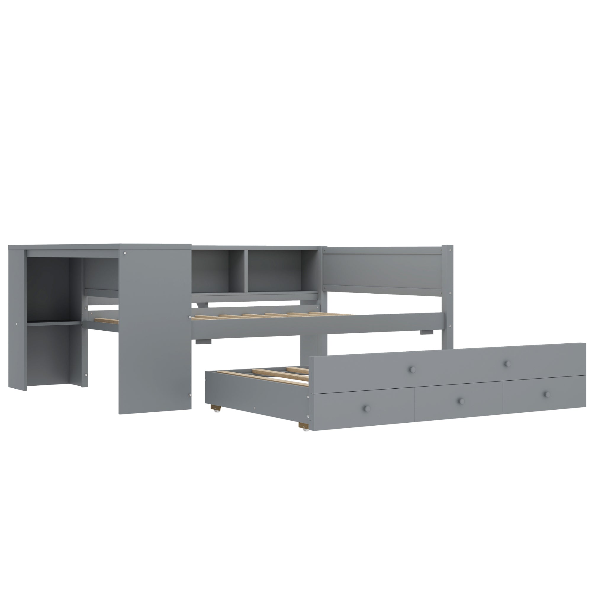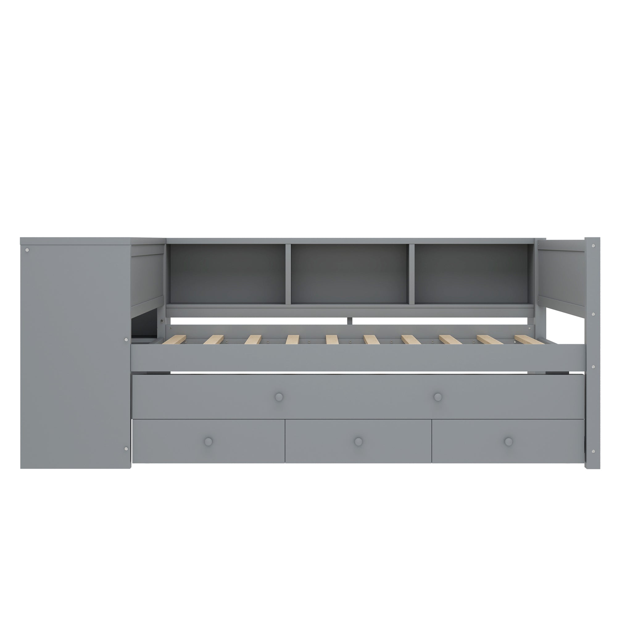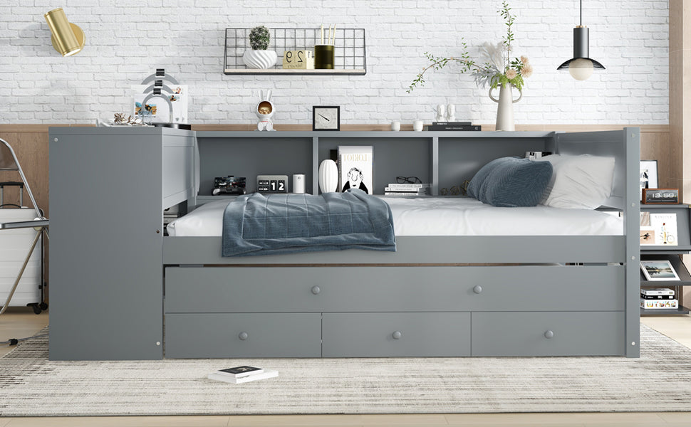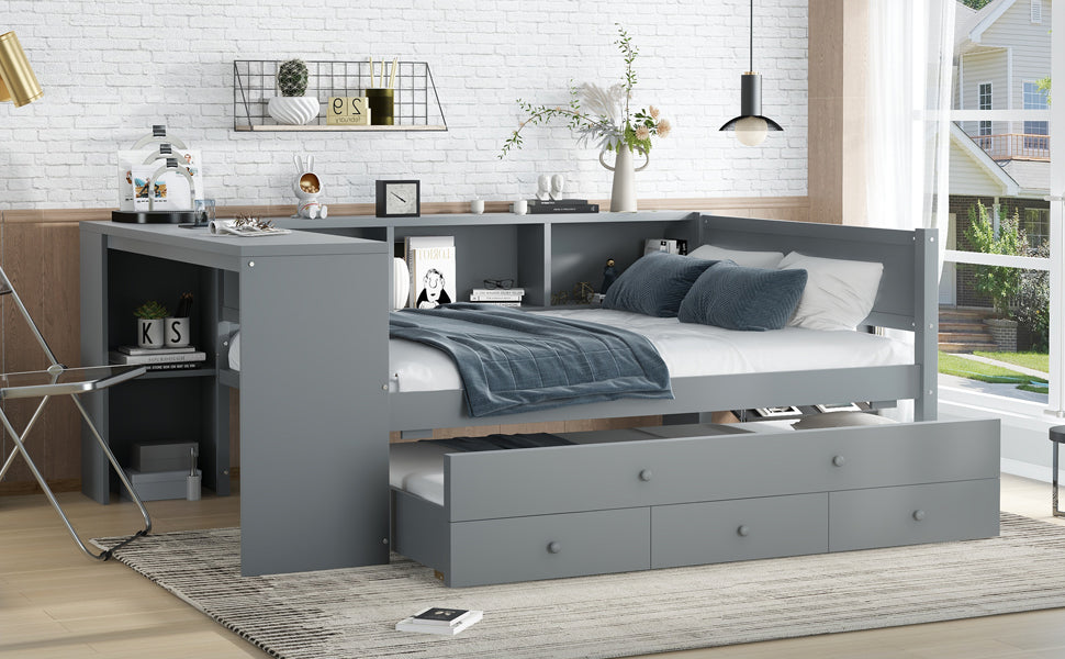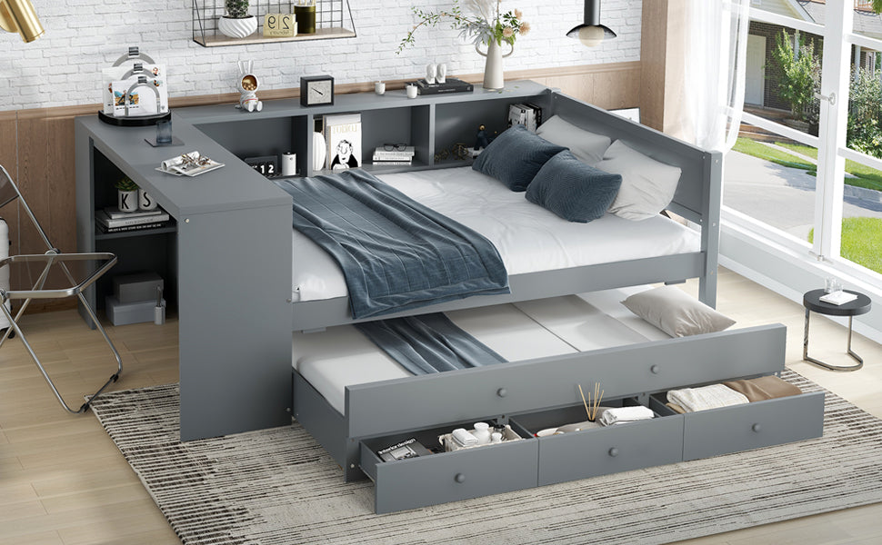 Maximize your living space with a versatile full-size daybed that blends practical storage, workspace, and comfortable sleeping options in a single, stylish piece. This multifunctional unit is ideal for small apartments, guest rooms, or kids’ rooms—offering a sturdy wood construction, integrated shelving, under-bed drawers, a pull-out trundle, and a convenient tray board for everyday use.