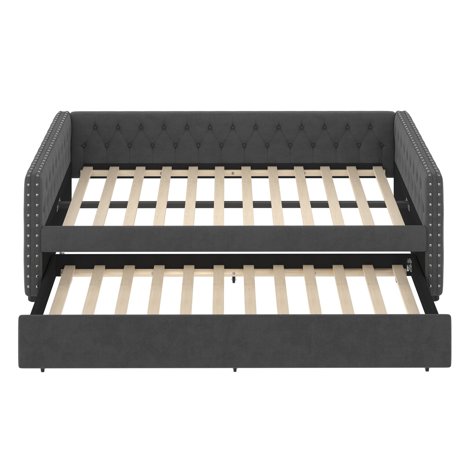 This elegant upholstered daybed with a twin trundle blends classic tufted styling and modern functionality to create a versatile seating and sleeping solution for guest rooms, home offices, or living spaces. Detailed button tufting, copper nailhead accents along square arms, and a cushioned linen-like fabric create a tailored look, while a sturdy wooden frame and included trundle provide reliable support for overnight guests or daytime lounging.