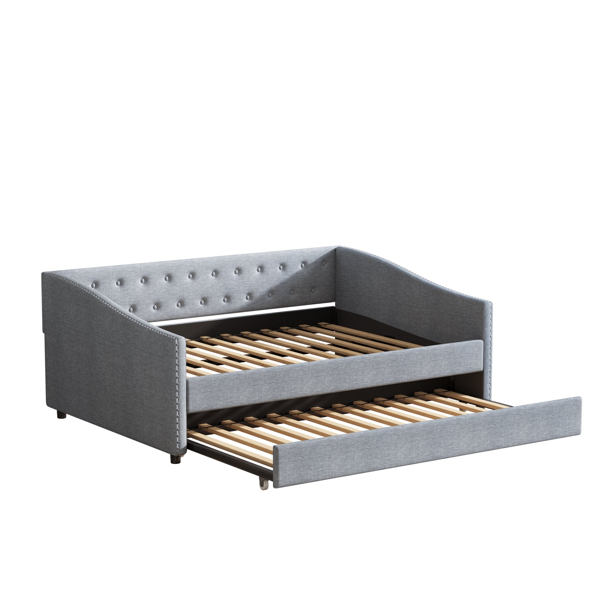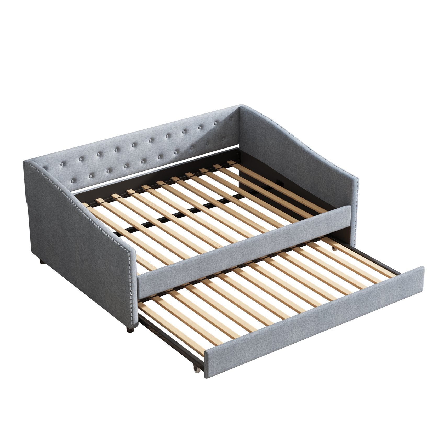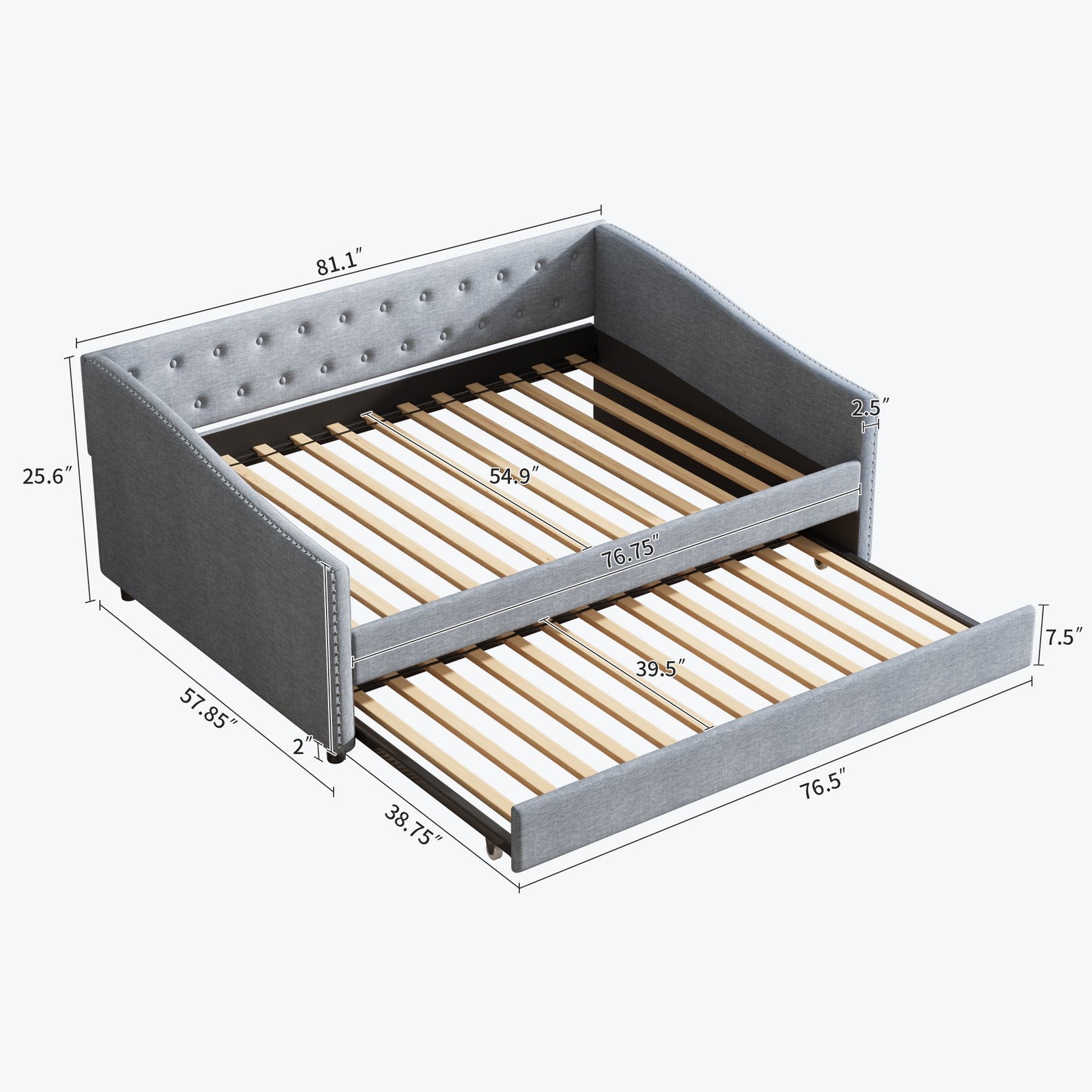 Transform any room into a stylish, multi-functional space with this upholstered full-size daybed and twin trundle. Designed for comfort and visual appeal, it blends traditional tufting and button details with modern waved arms accented by copper-tone nailhead trim. Ideal for guest rooms, home offices, or studio apartments, this piece offers sturdy construction, breathable comfort, and a space-saving trundle for overnight guests.