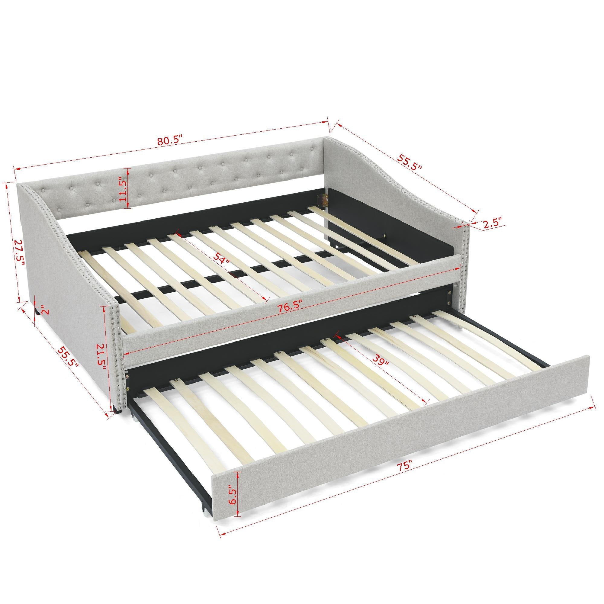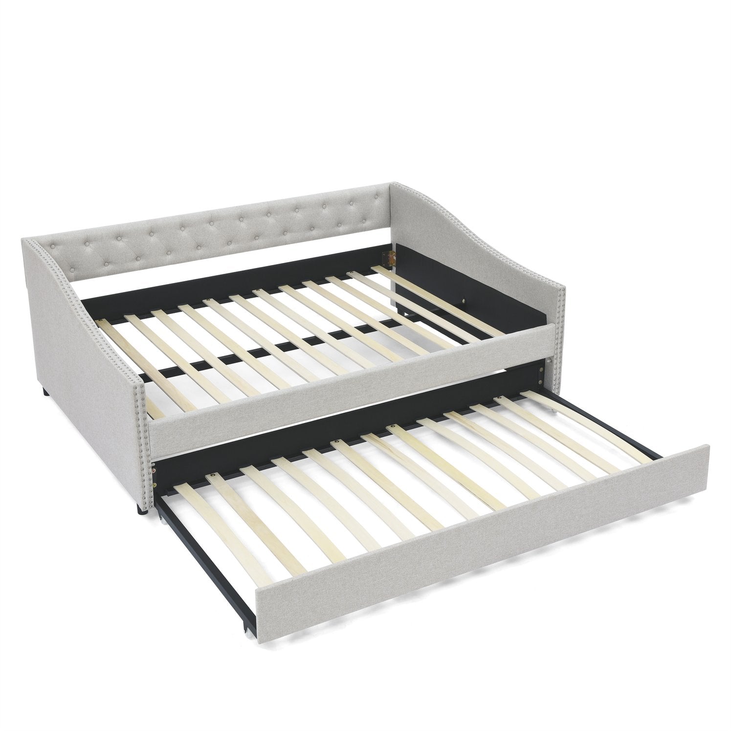 Bring classic elegance and versatile functionality to your guest room or living space with this upholstered tufted daybed and twin trundle. Designed for comfort and style, it features button-tufted back, waved arms accented with copper nailhead trim, and a sturdy eucalyptus-and-wood frame that supports everyday use and overnight guests.