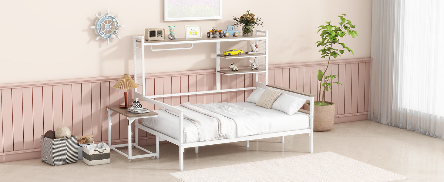 Create a stylish, space-saving centerpiece for bedrooms, studio apartments, or multipurpose rooms with this full-size metal daybed. Thoughtfully engineered to combine sleeping, working, and storage in one compact unit, it blends industrial design with practical features—perfect for small spaces, student housing, or guest rooms that need to do more.