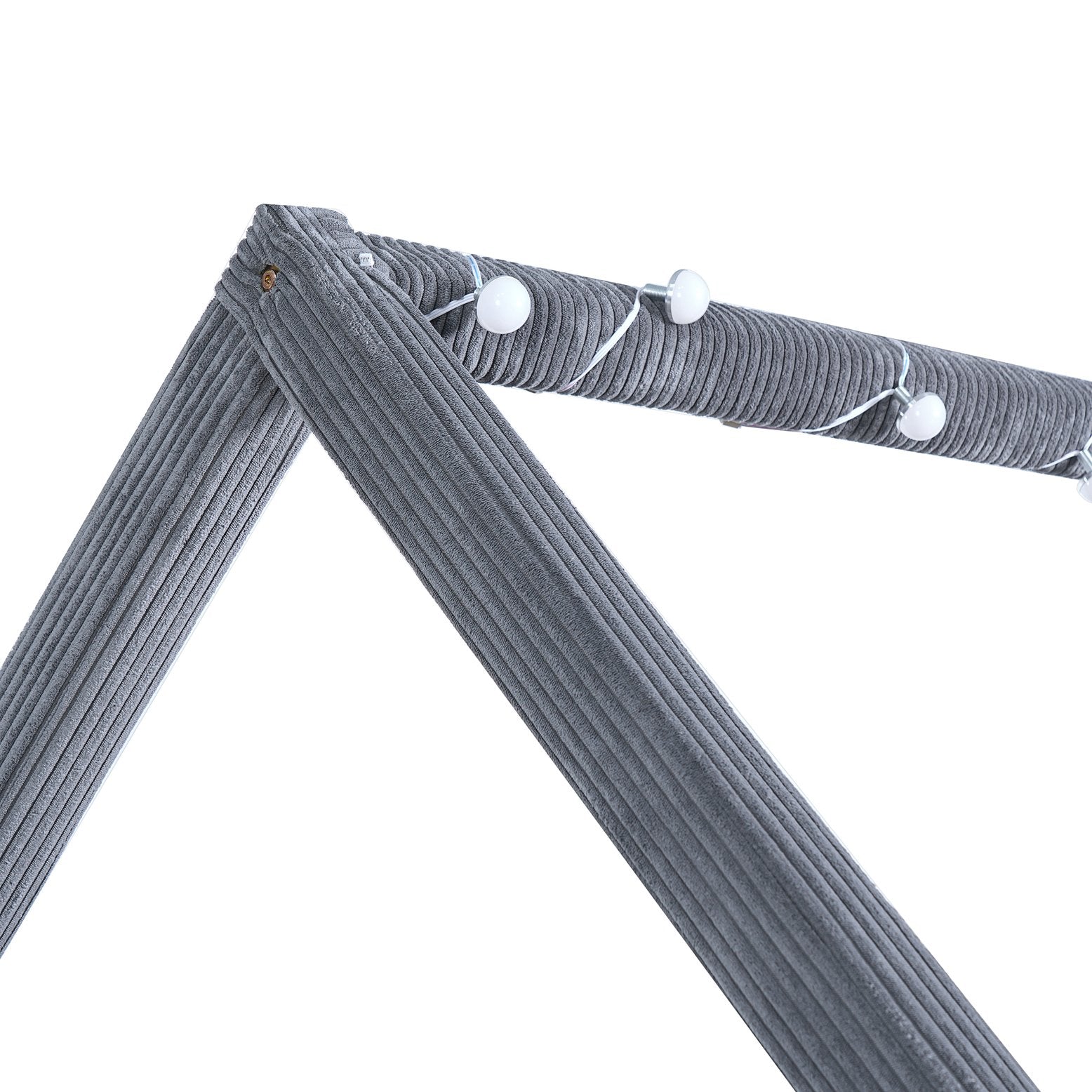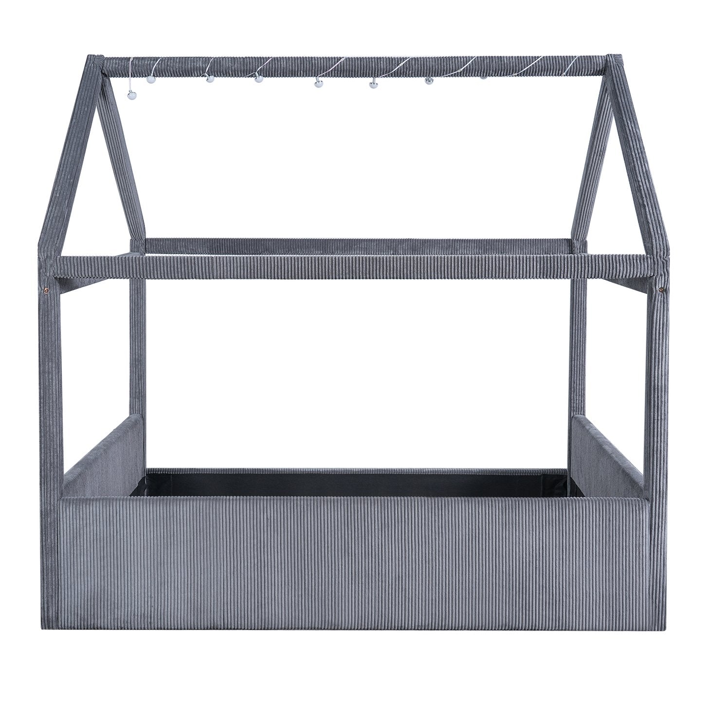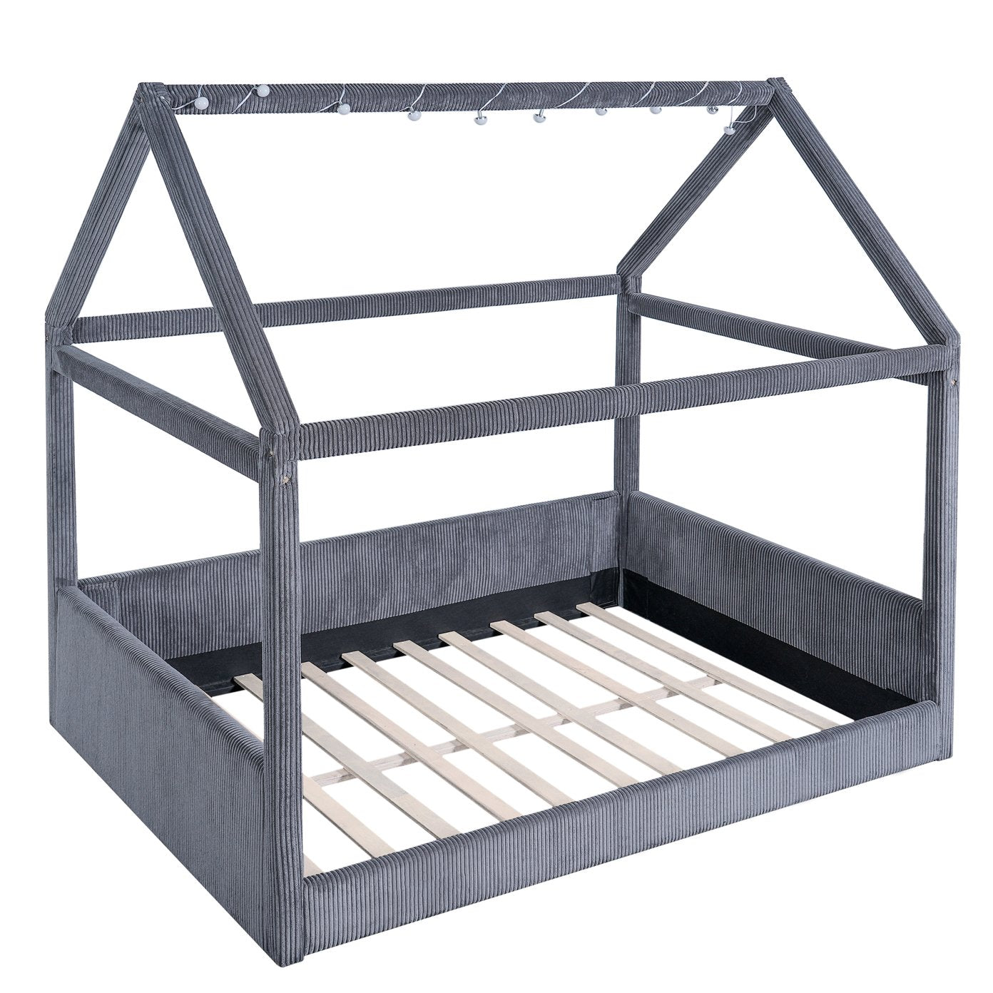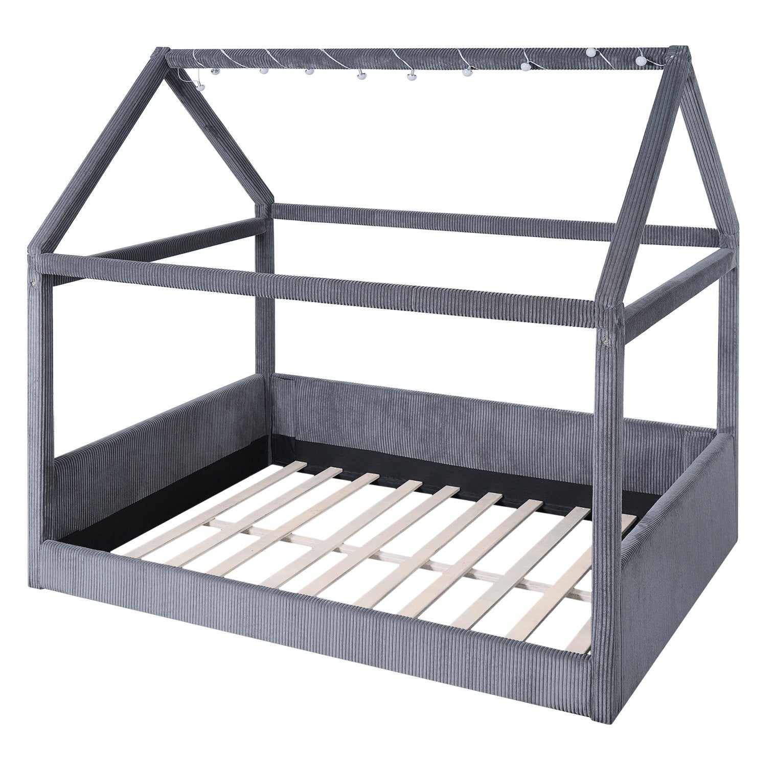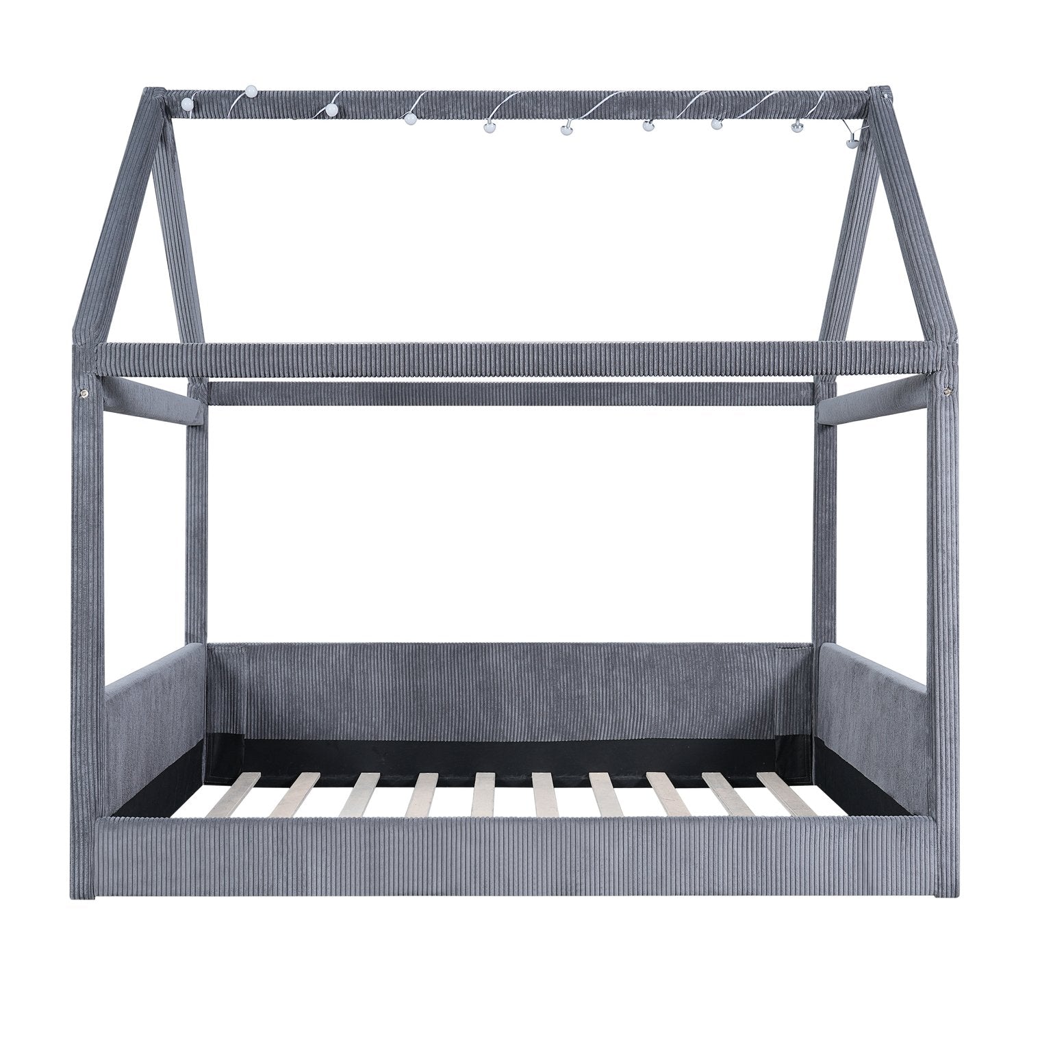 Create a whimsical yet sophisticated focal point for any bedroom with this full-size upholstered house daybed. The charming house-shaped frame and plush corduroy upholstery blend playful design with refined details, while solid pinewood construction and engineered MDF ensure long-lasting durability. Integrated LED light strips with a touch switch add ambiance with two color options (white and warm), making this piece perfect for both daytime lounging and cozy evenings.