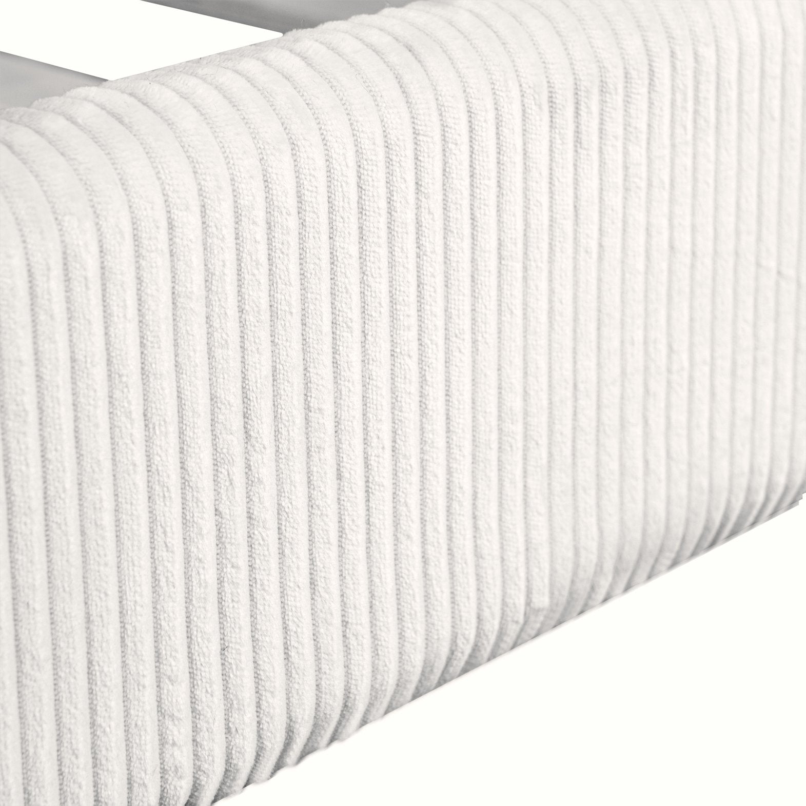 - Frame & materials: Solid pinewood frame with engineered MDF for durability; foam-filled corduroy fabric upholstery with vertical channel tufting on headboard, footboard, and backrest.