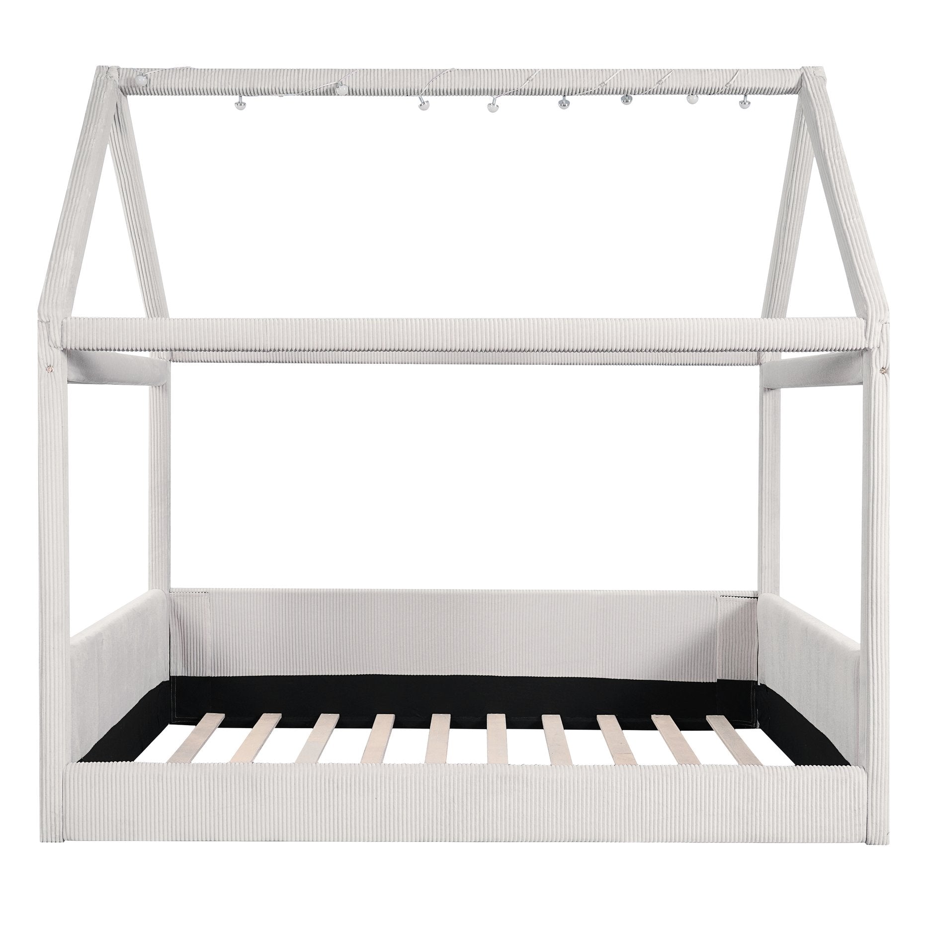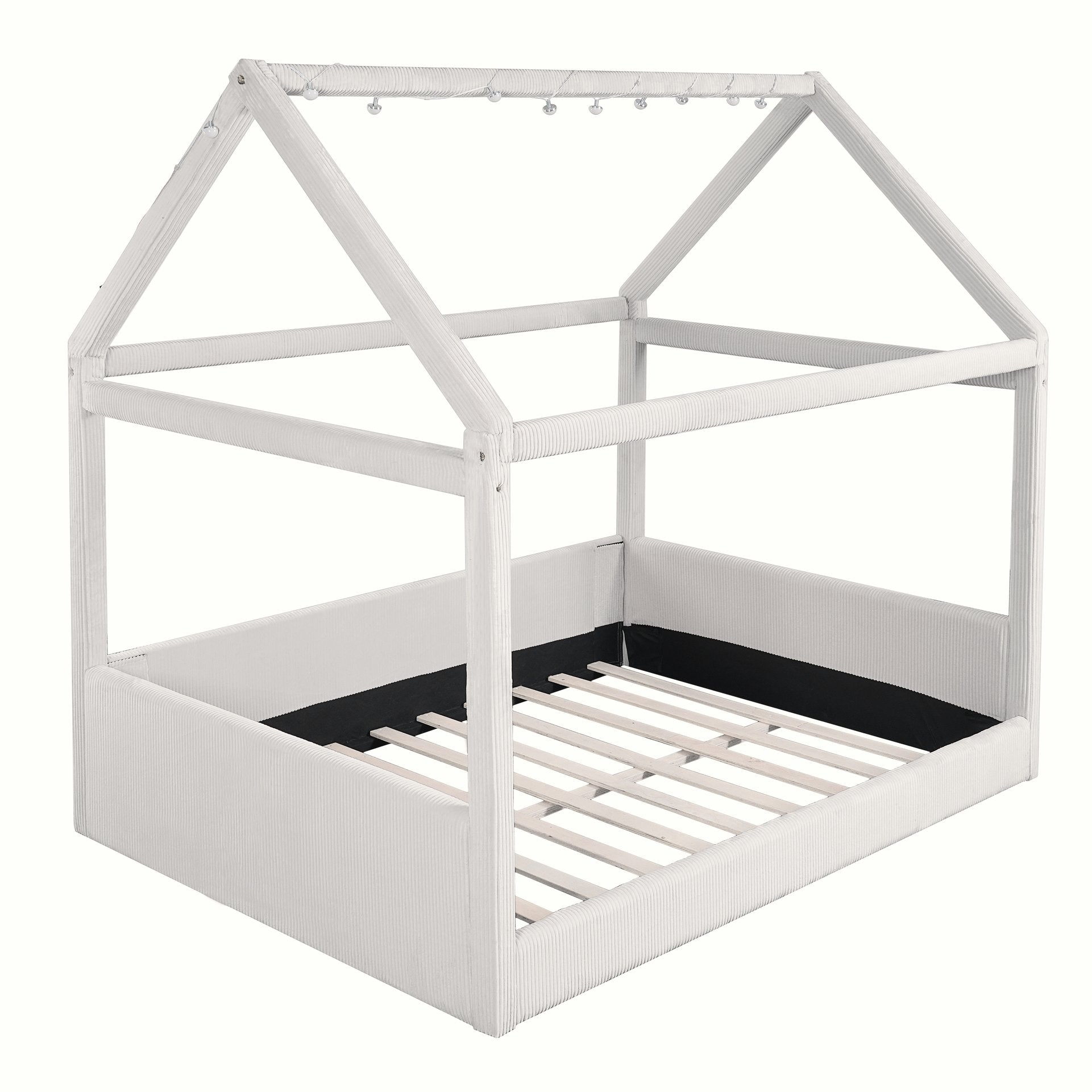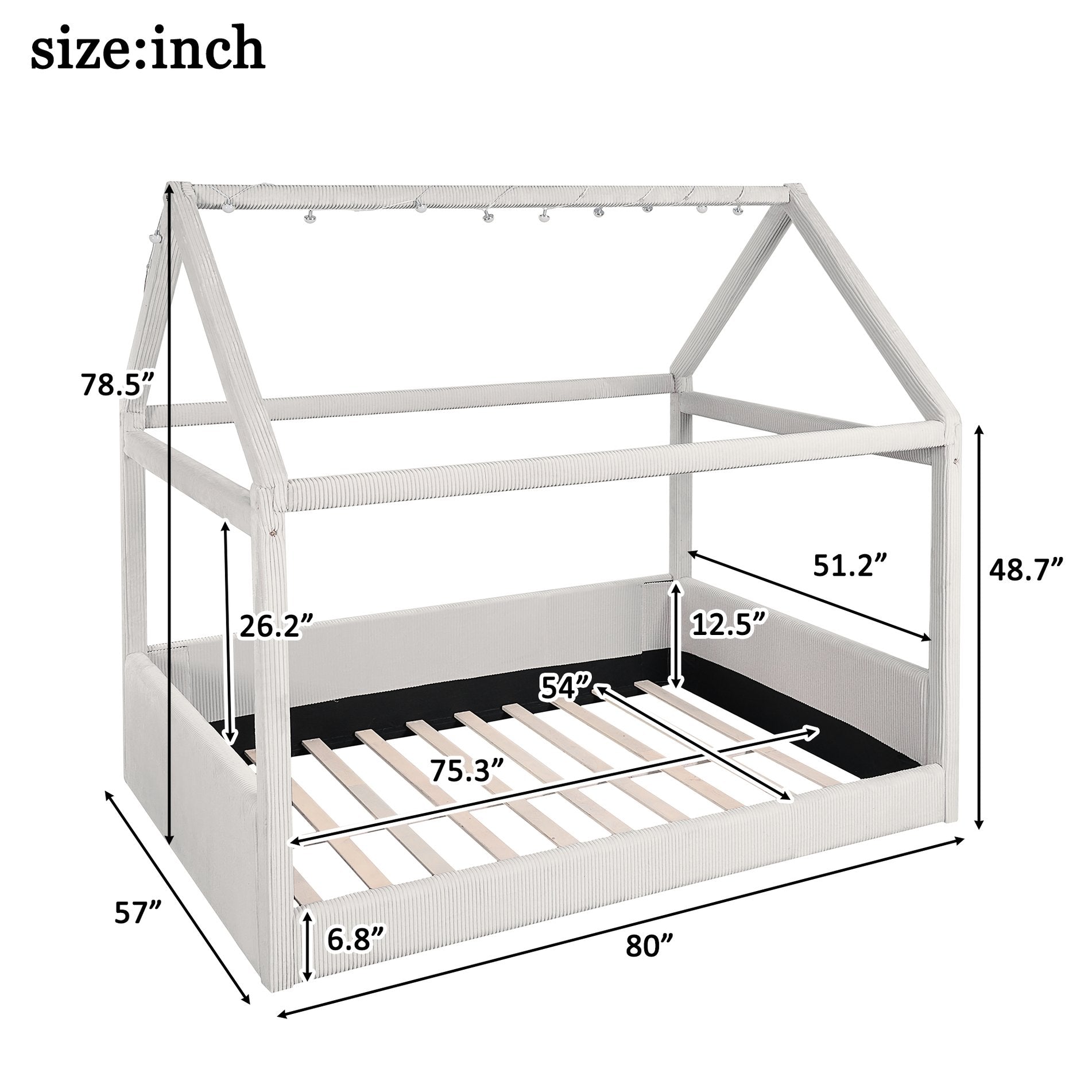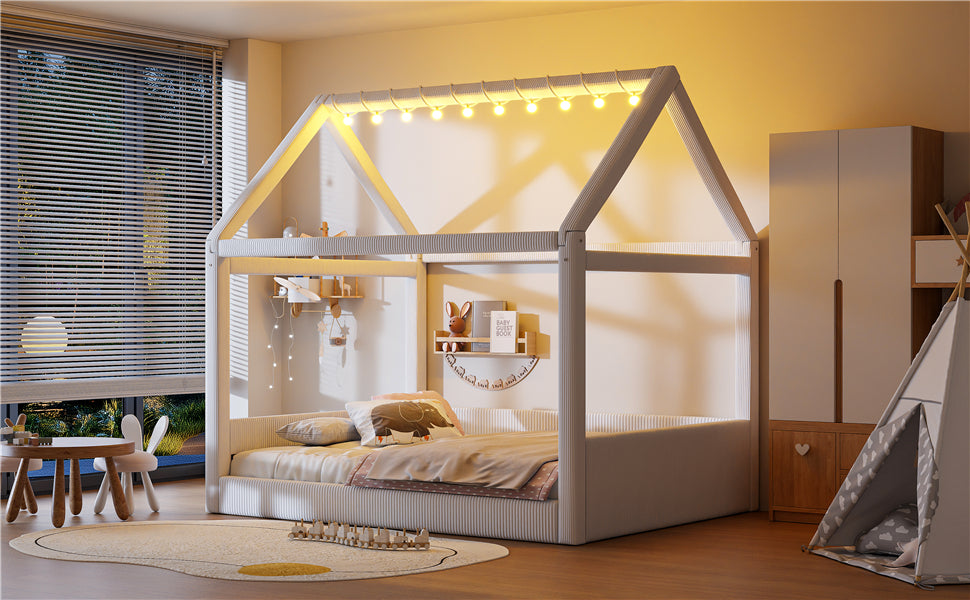 Turn any bedroom into a cozy, imaginative retreat with this full-size upholstered house daybed. The charming house-shaped frame and corduroy-upholstered panels create a playful yet refined centerpiece, while built-in LED light strips provide customizable ambient lighting for reading or relaxing. Crafted from solid pinewood and engineered MDF, the bed blends sturdy construction with a soft, luxe finish—ideal for kids’ rooms, guest spaces, or stylish studio living.